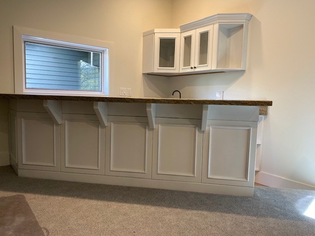 We went with custom cabinets with lots of pullouts for ease of accessibility. They have been painted a light grey, Benjamin Moore’s Classic Gray.