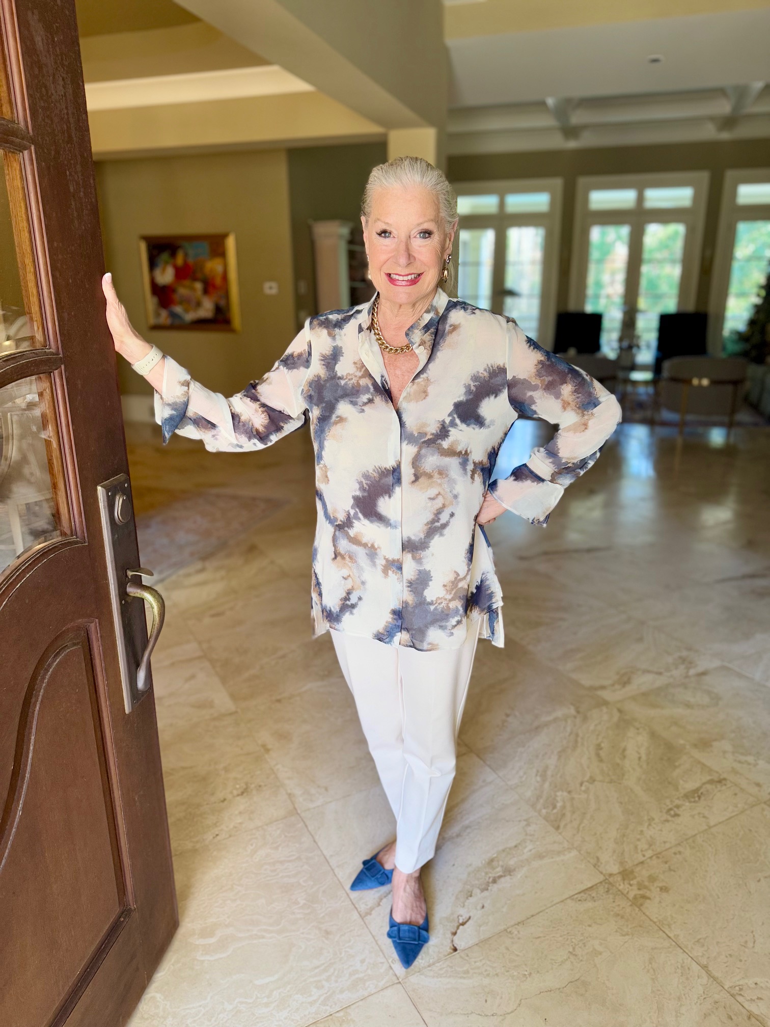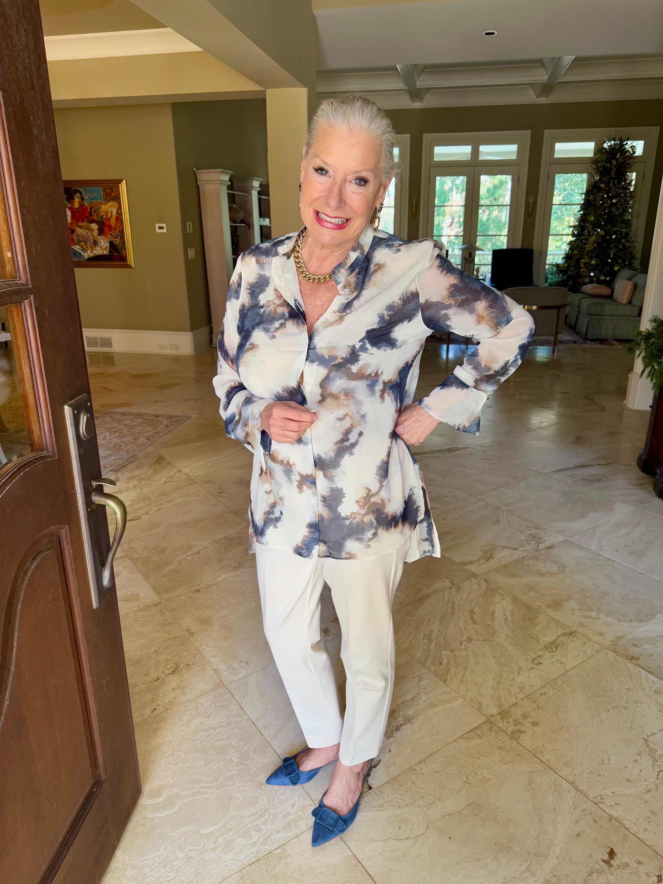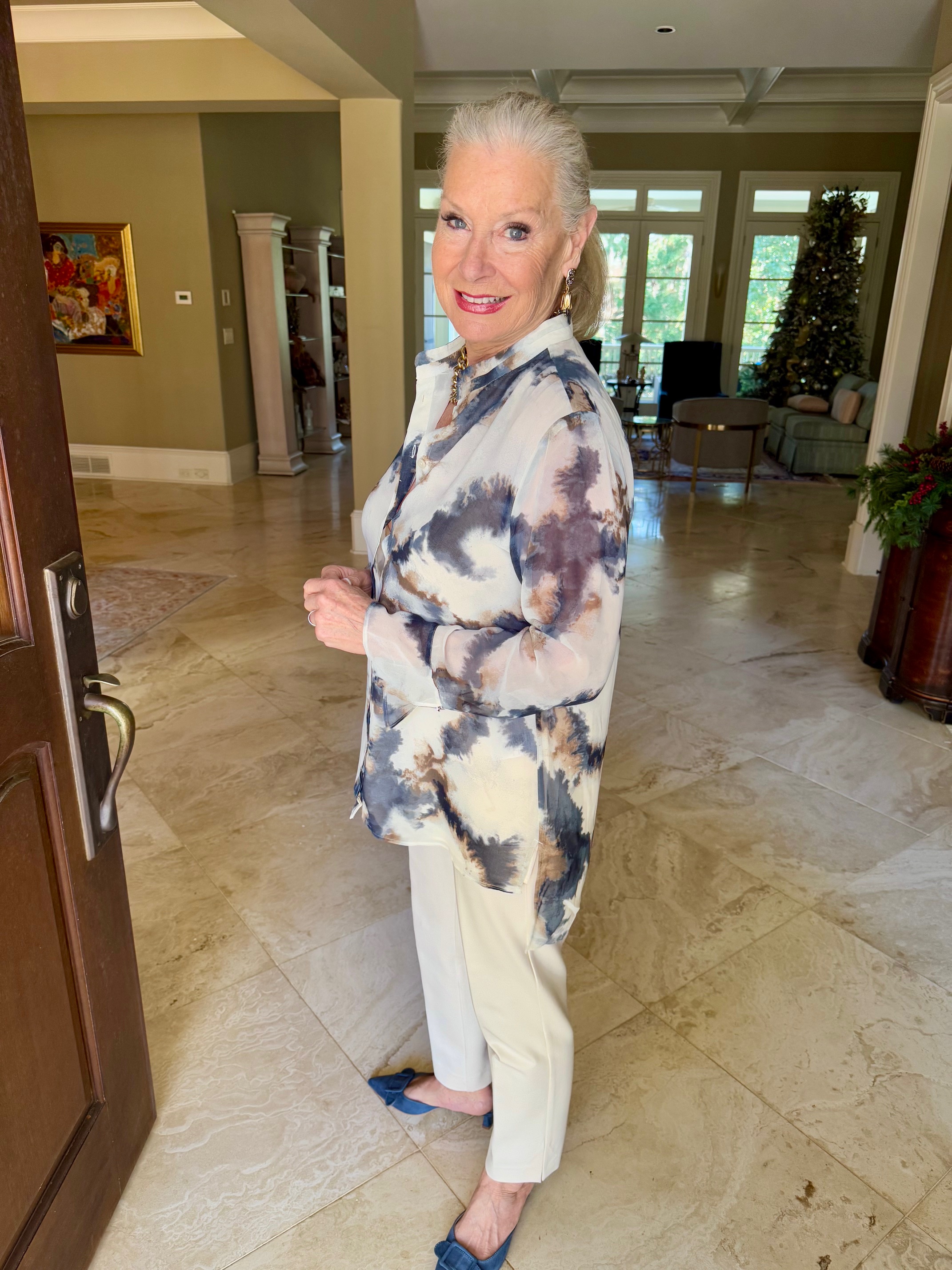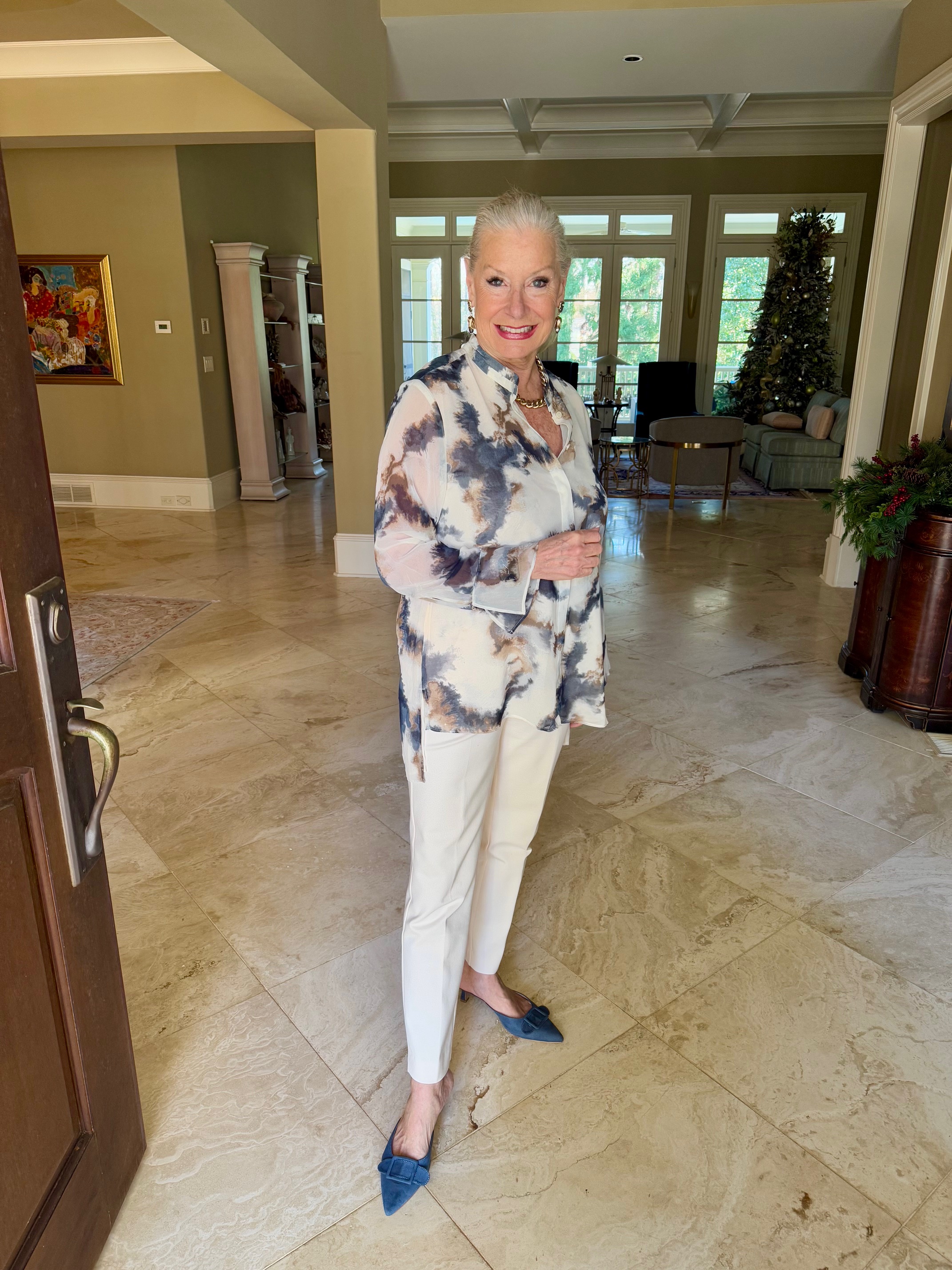 I went shopping at Chico’s during their Semi-Annual Sale and came home with lots of fun tops to wear in January. I absolutely love this tie-dye high-low tunic, which I am wearing with Chico’s Juliet Ponte trim-detail ankle pants and the blue denim Journee Collection Vianna Mule, which you have seen before. My No Droop™ Embellished Tulip Drop Earrings are new from Chico’s.