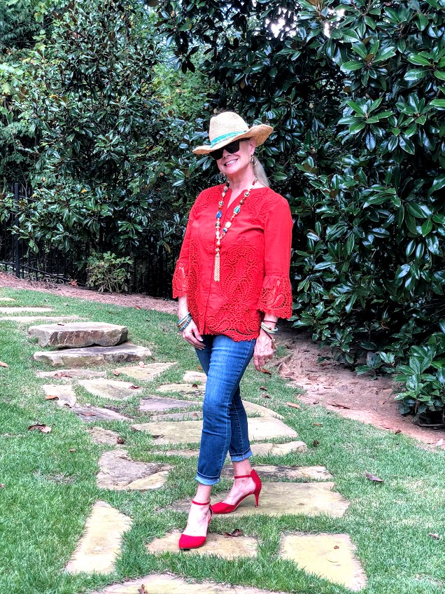 These jeans look great on you Robin! I love the color of your blouse too – that paprika color looks so good with colors in your necklace and your hat is so fun! I have found that Old Navy Rockstar jeans fit me best – they have enough stretch to be comfortable but they hold their shape.
