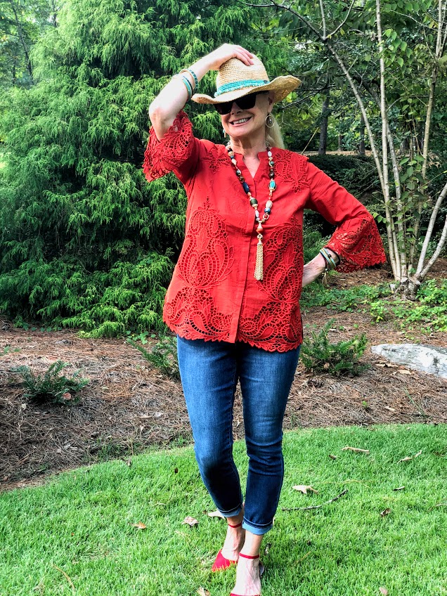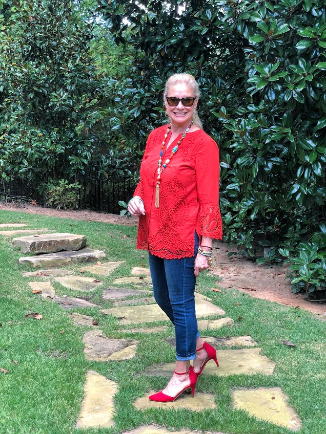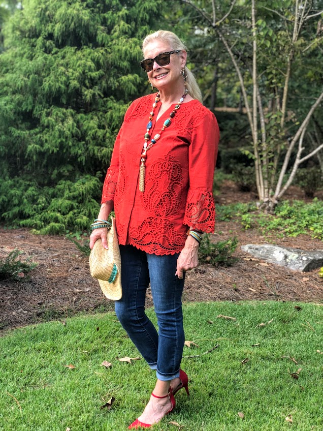 I selected the paprika-colored cutout lace detail tunic from Chico’s to wear with my skinny ankle jeans but it’s currently out of stock.