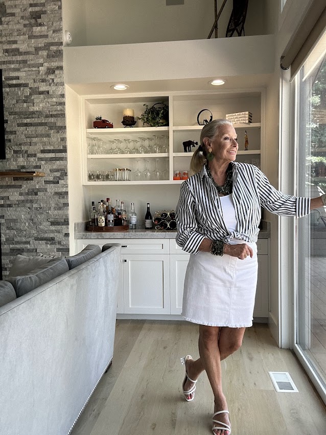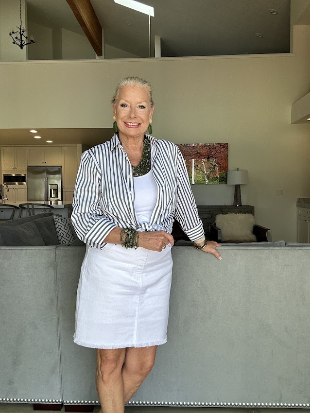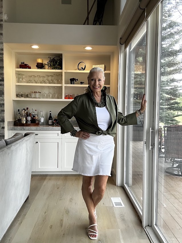 I’m wearing Chico’s No Iron™ Stretch 3/4 Sleeve Shirt in Olive as an extra layer over the Microfiber Tank and the No Stain Pull-on Fray Hem Skort. Look how the olive green shirt and jewelry pops against the white pieces!