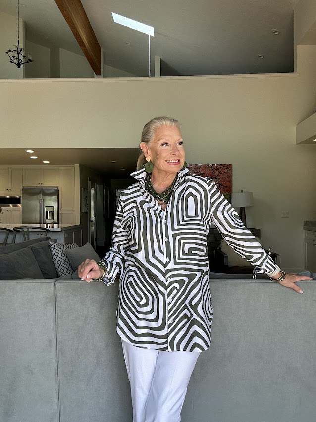 I received a lot of olive green clothes from Chico’s in July. This color is easy to wear now and later in the fall. You can wear it now with white and then, as the weather gets colder, wear it with darker pieces.