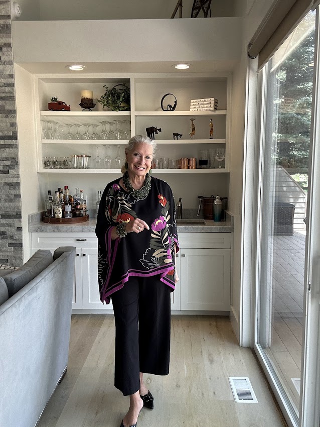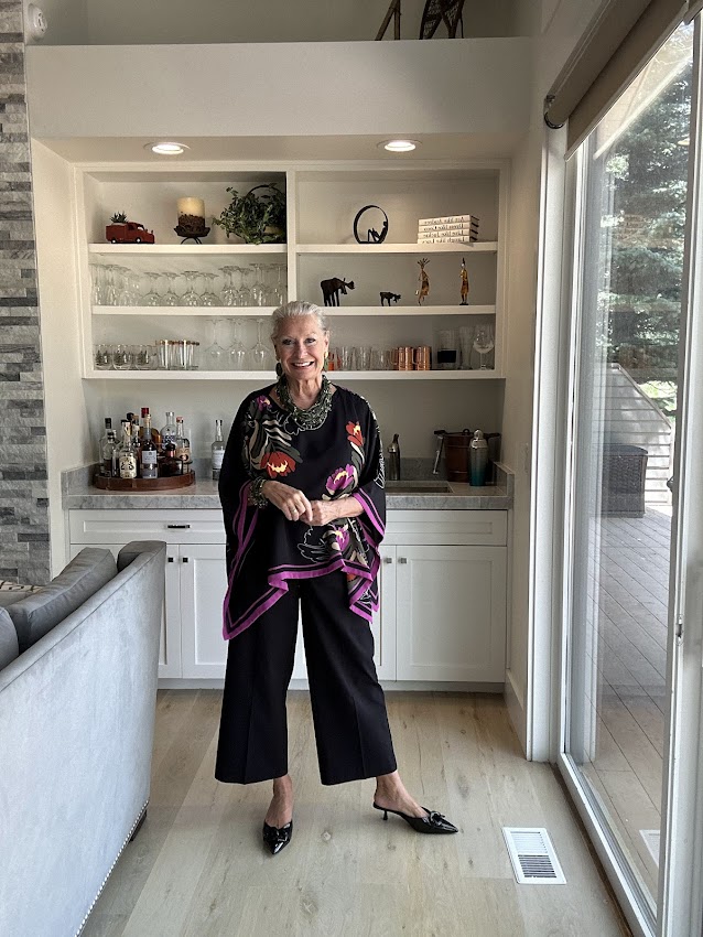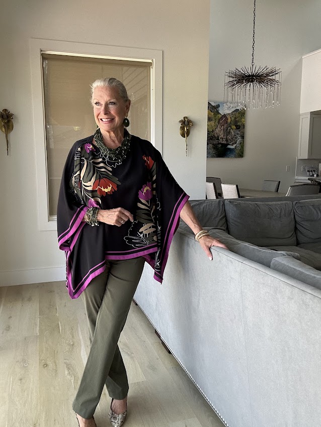This stunning Floral Border Trim Poncho pairs well with olive green Brigitte 360 Pants or the Brigitte Wide-Leg Cropped Pants in Black. The colors are rich and perfect for fall and winter.