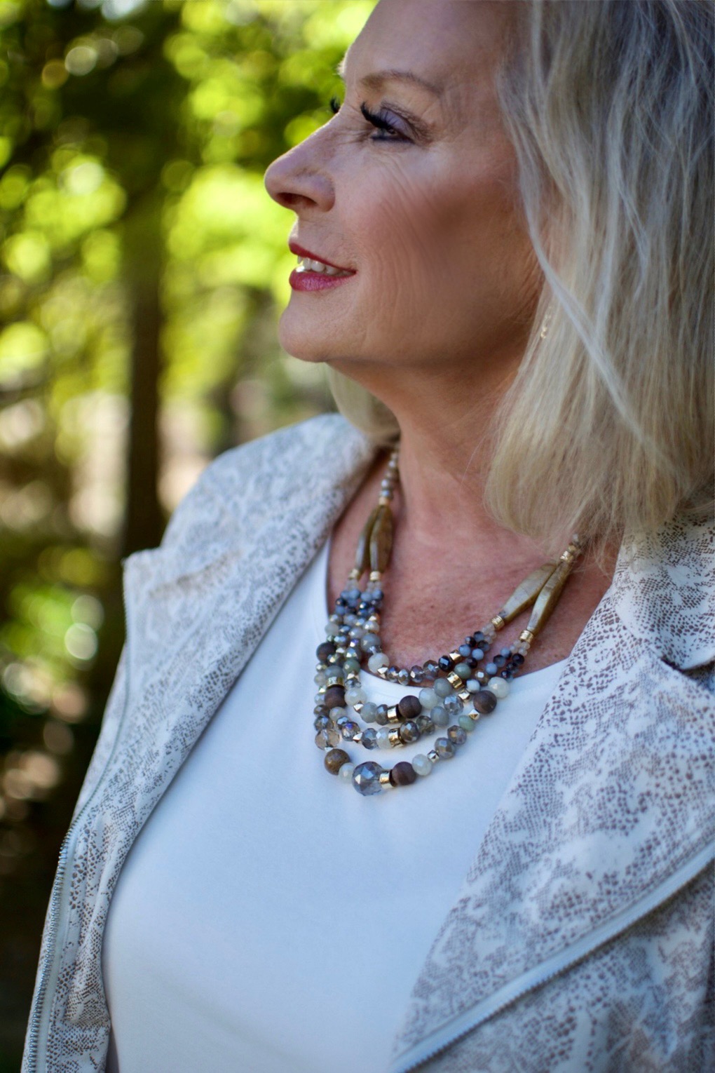 I finished off the monochromatic outfit with the MIXED MULTI-ROW NECKLACE. This elaborate 4-strand beaded necklace is a mix of metallic hues and offers endless options for versatility.