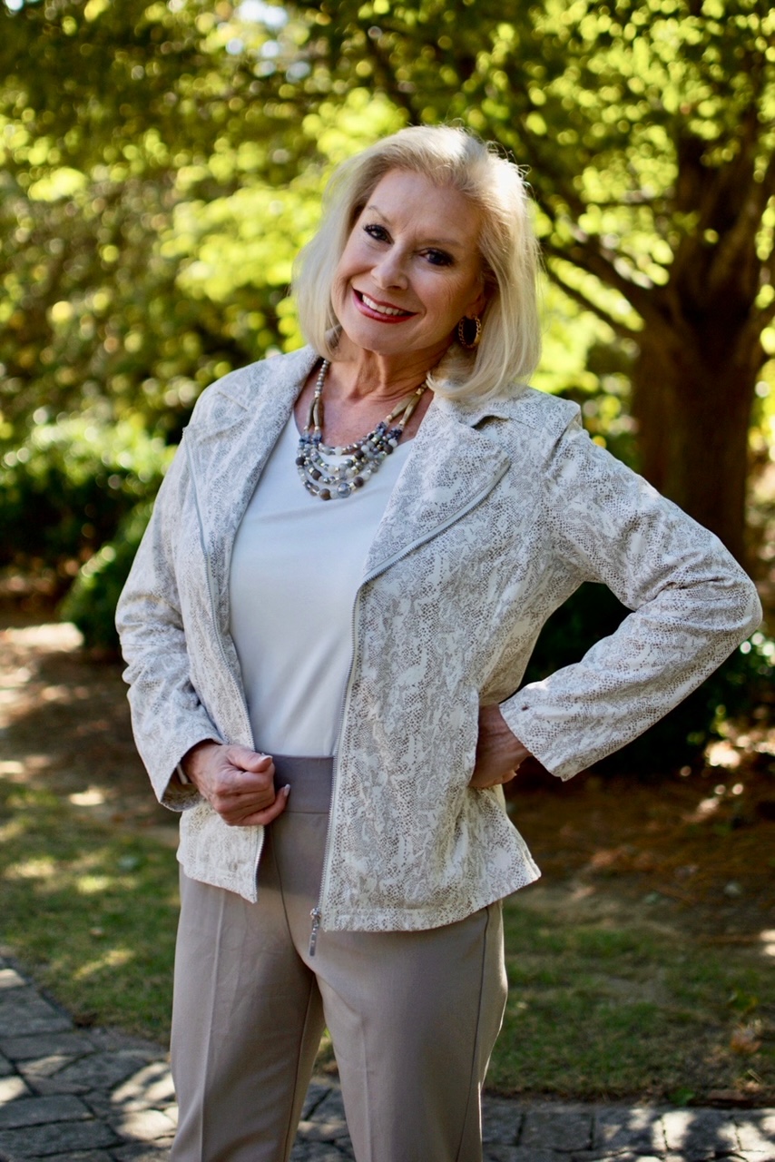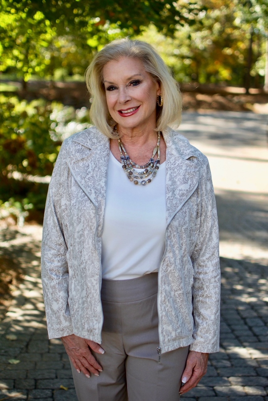 Monochrome fashion is a trend that has been around for a while and is still going strong. It’s a great way to create contrast, as well as to create an impact. Today I’m sharing this fabulous Phyton Print Moto Jacket from Draper’s and Damon’s fall collection styled in a neutral monochromatic style.