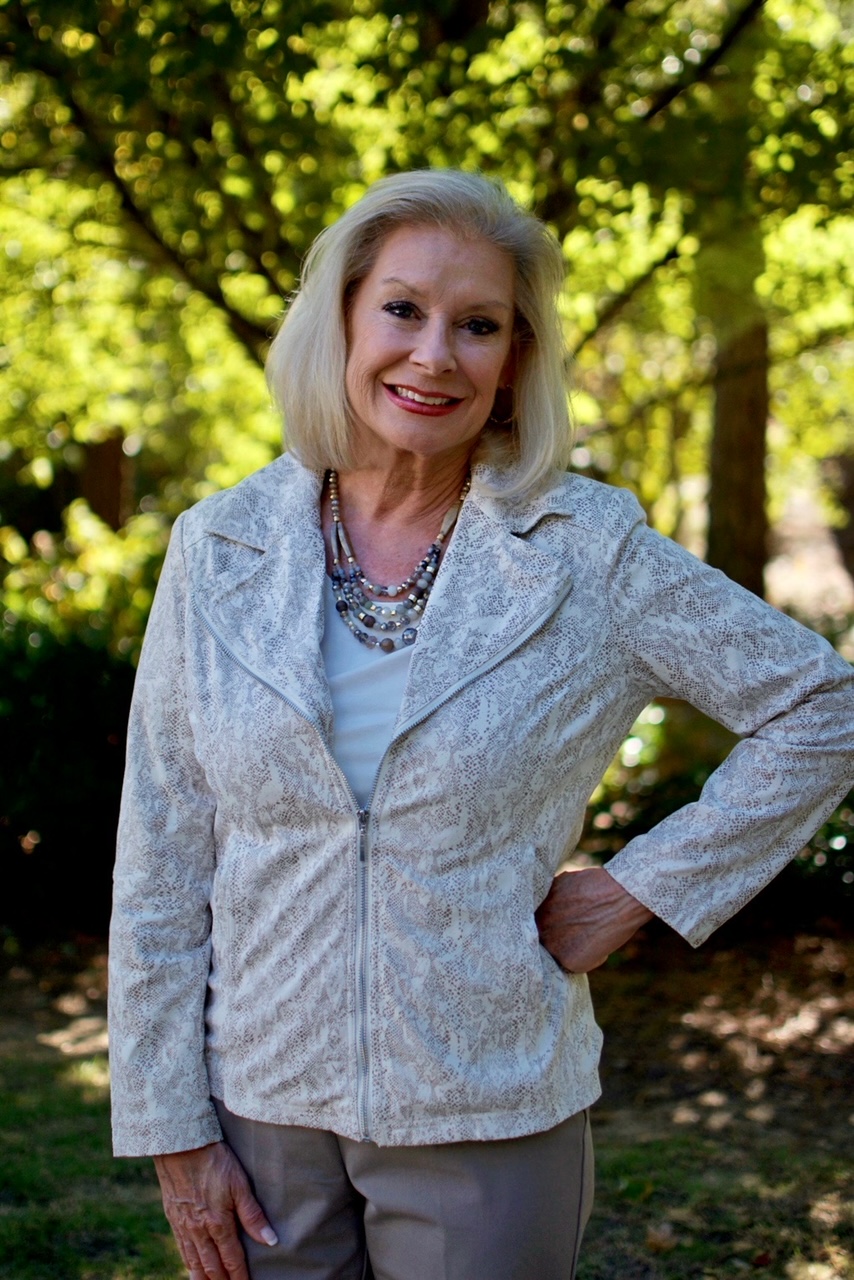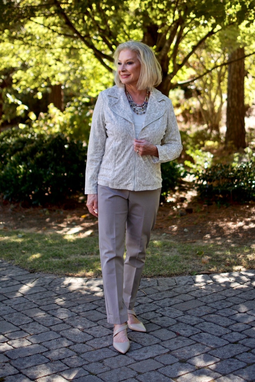 I paired the jacket with Draper’s & Damon’s SILKY KNIT TOP and SLIMTACULAR® FLEX FIT PANTS! You have already seen me wear pants in New Khaki in this post. This color is called Driftwood. When pants are this comfortable and make you look good buy them in as many colors as you can!