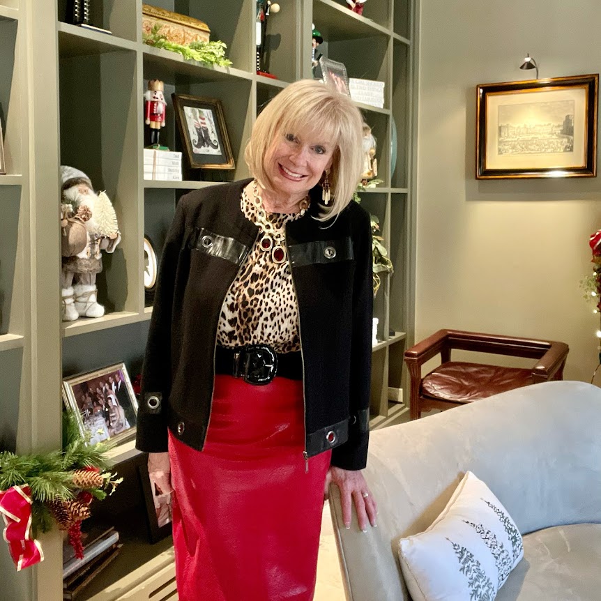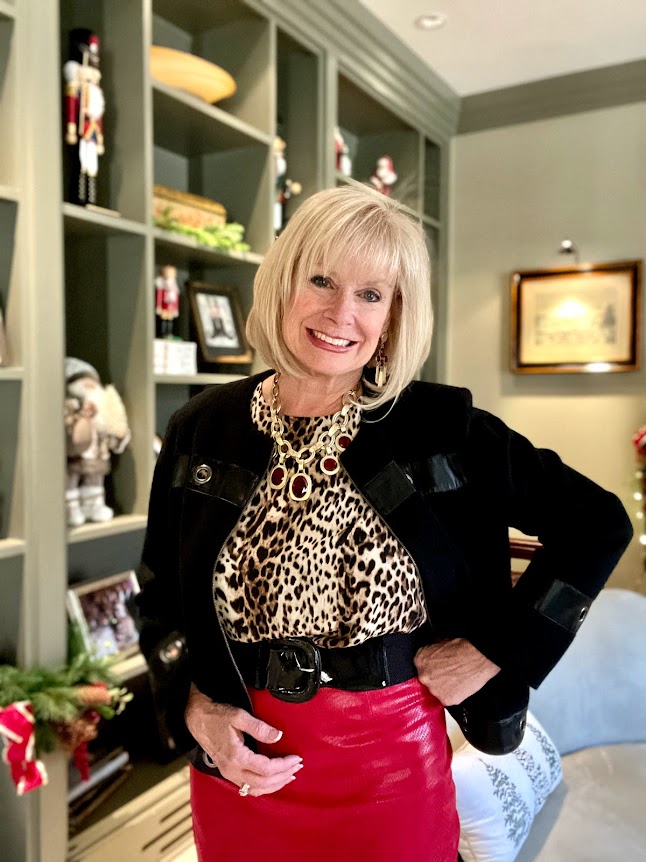 It’s the holiday party season! After missing so many parties that were canceled in 2020, we’re back to celebrating again! One of my favorite pieces to wear at Christmas is this red leather skirt. It’s been worn every Christmas for the last 15 years! I used to wear cute Christmas sweaters, but now I love wearing leopard print with this skirt. I love this color combination. Do you wear red and leopard print for the holidays?.