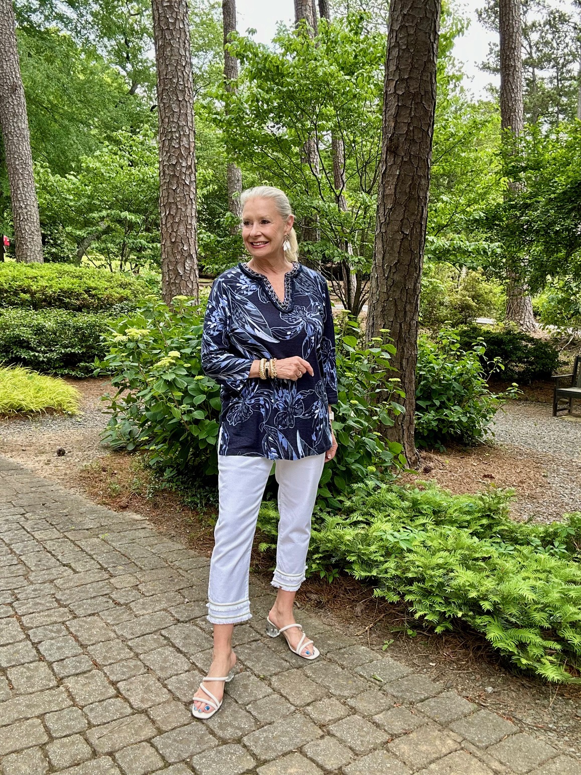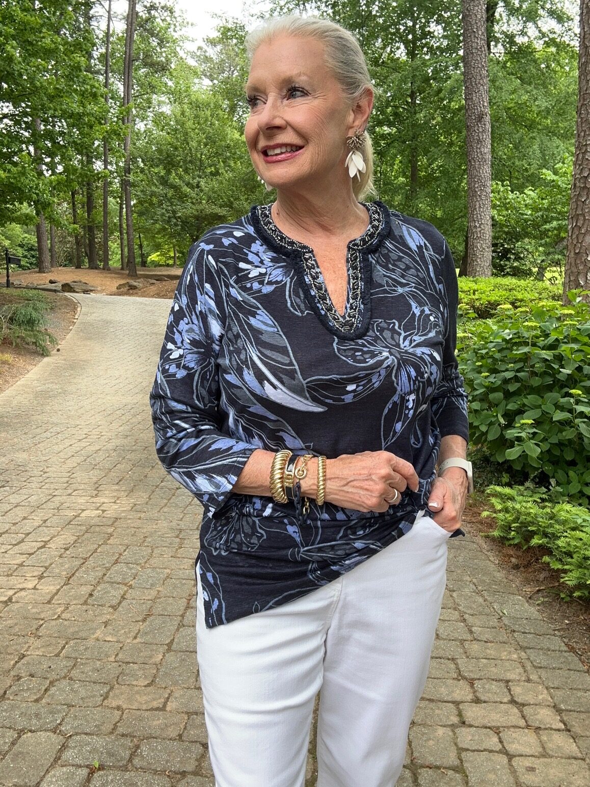 This Linen Floral Embellished Tunic is so soft! This all-linen design features the ease of a linen body, plus face-flattering bead details with fringe accents on the split neck. Wear it with crops or pants for a simple and stylish way to dress for the day. I am wearing the No Stain Girlfriend Embellished Hem Cropped Jeans with the tunic. Cropped pants are so popular for the summer if you don’t want to wear shorts or capris.