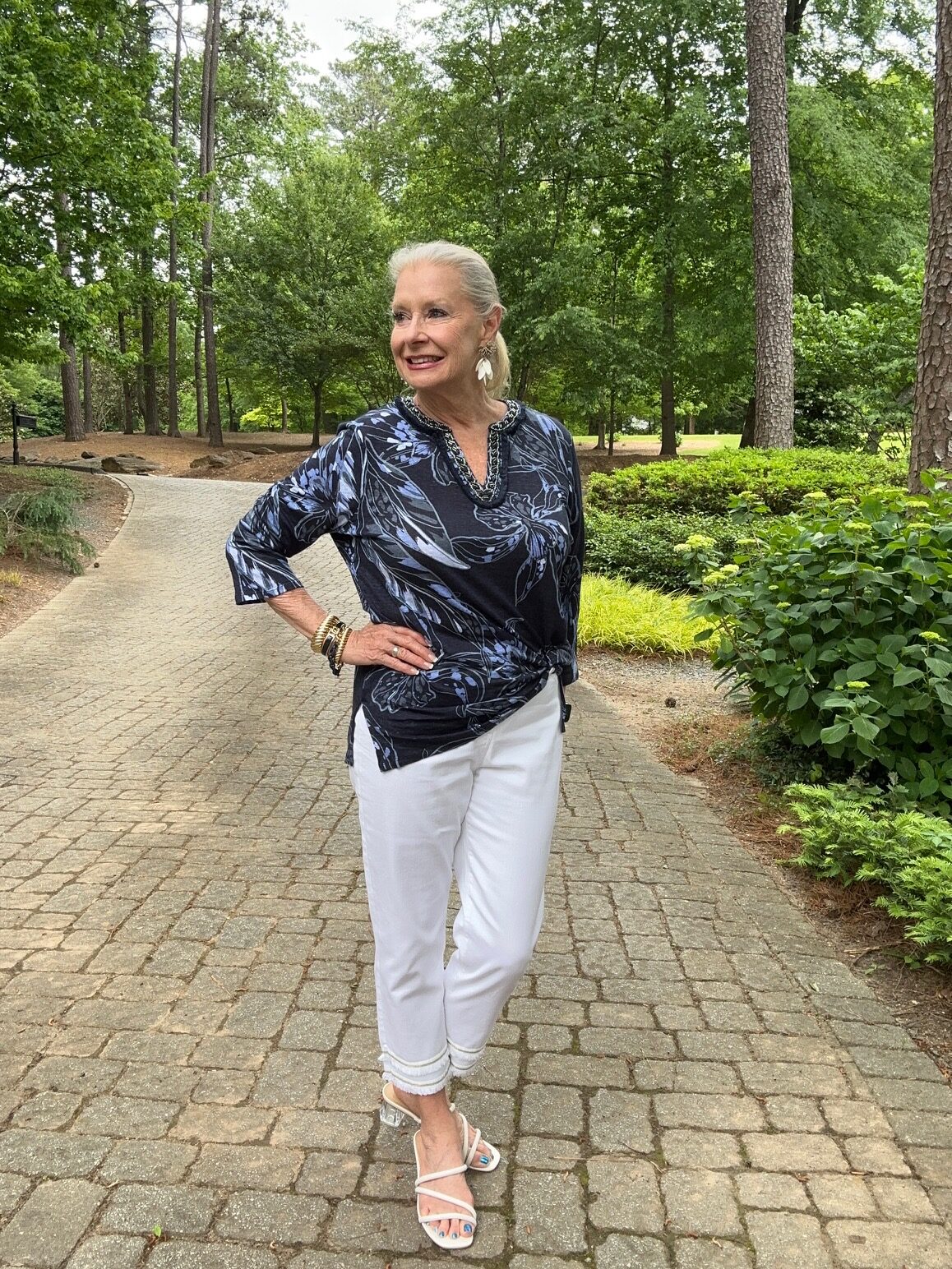 You can even tuck in one side of the tunic for a different look. I’m wearing the No Droop™ White Petal Earrings and the Lucite Heels with this outfit. However, the Embellished Denim Sneakers or the Raffia Ruffle Heels would also look nice. Switch out the earrings and wear the Jute Teardrop Earrings that I have shown you already.