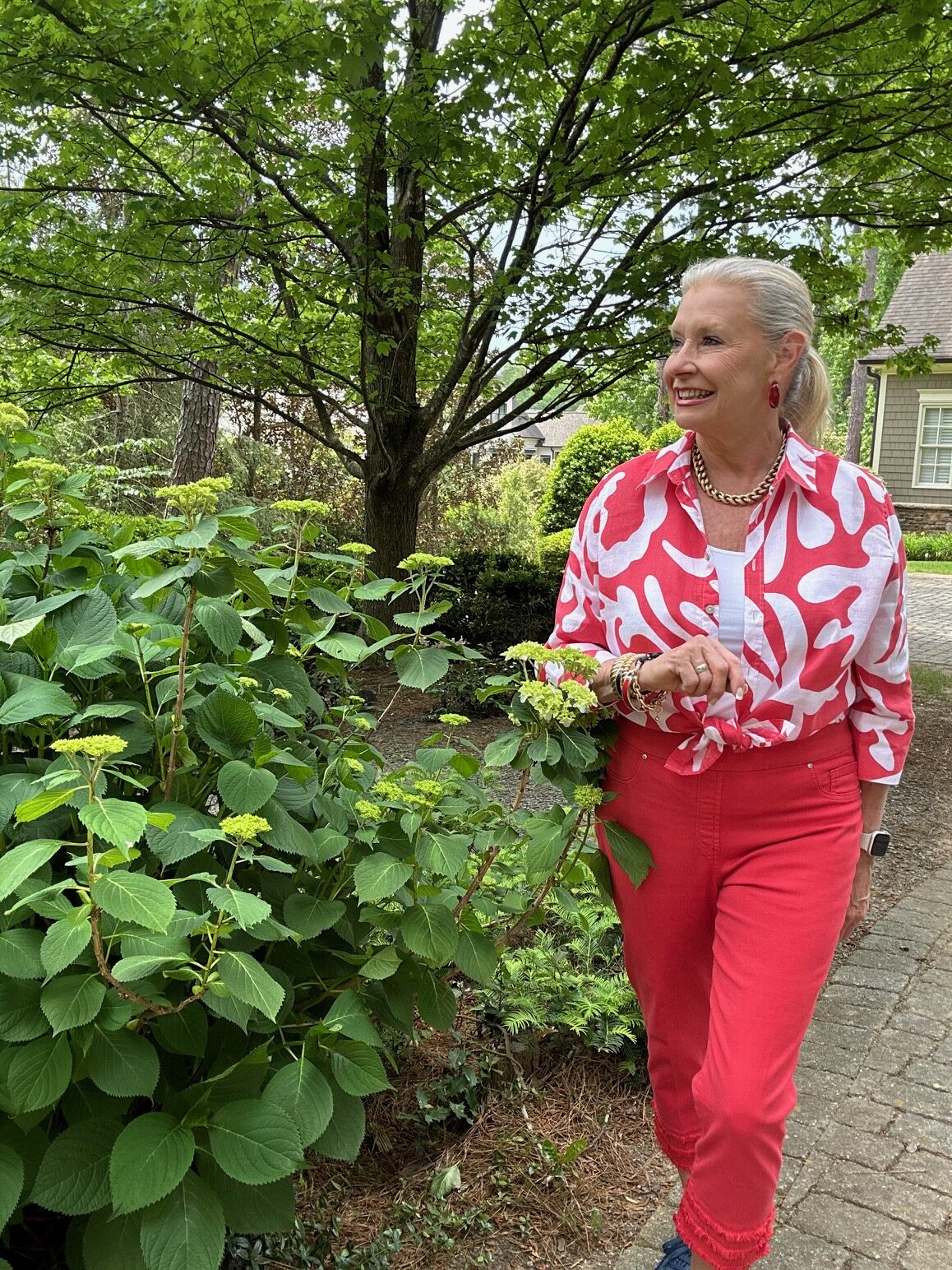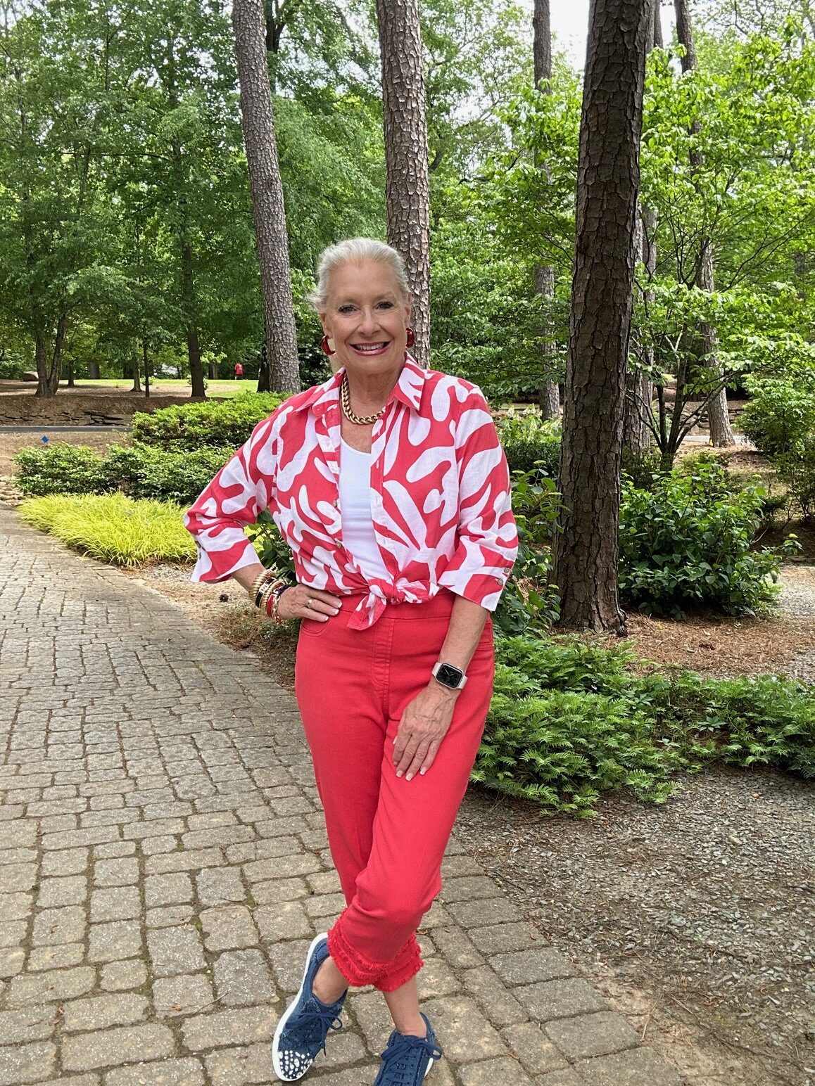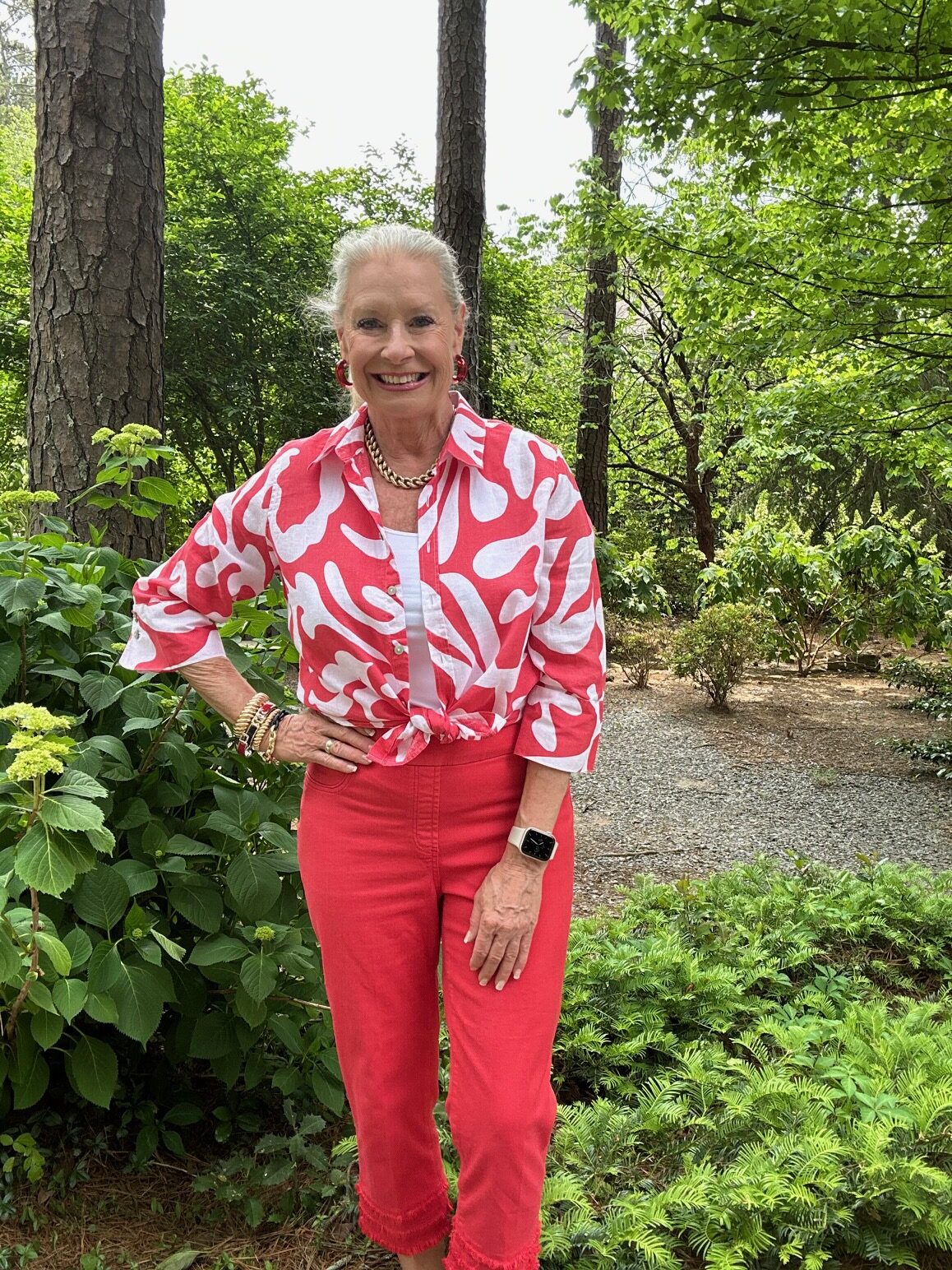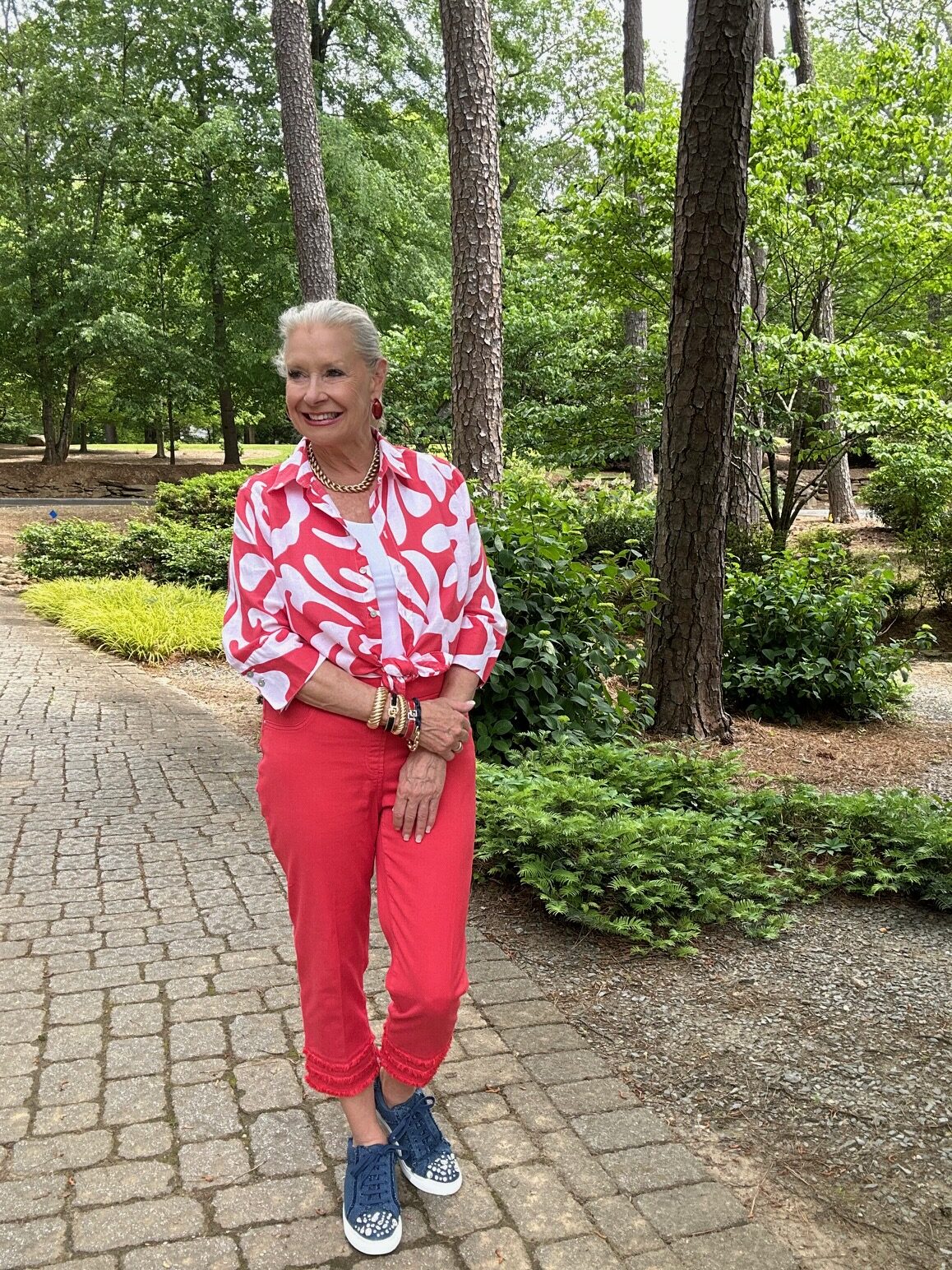 This time, I’m wearing the No Iron™ Linen Reef 3/4 Sleeve Shirt over a white Microfiber Tank with Chico’s Fray Hem Denim Pull-On Crops in watermelon punch. The cropped pants come in four colors.