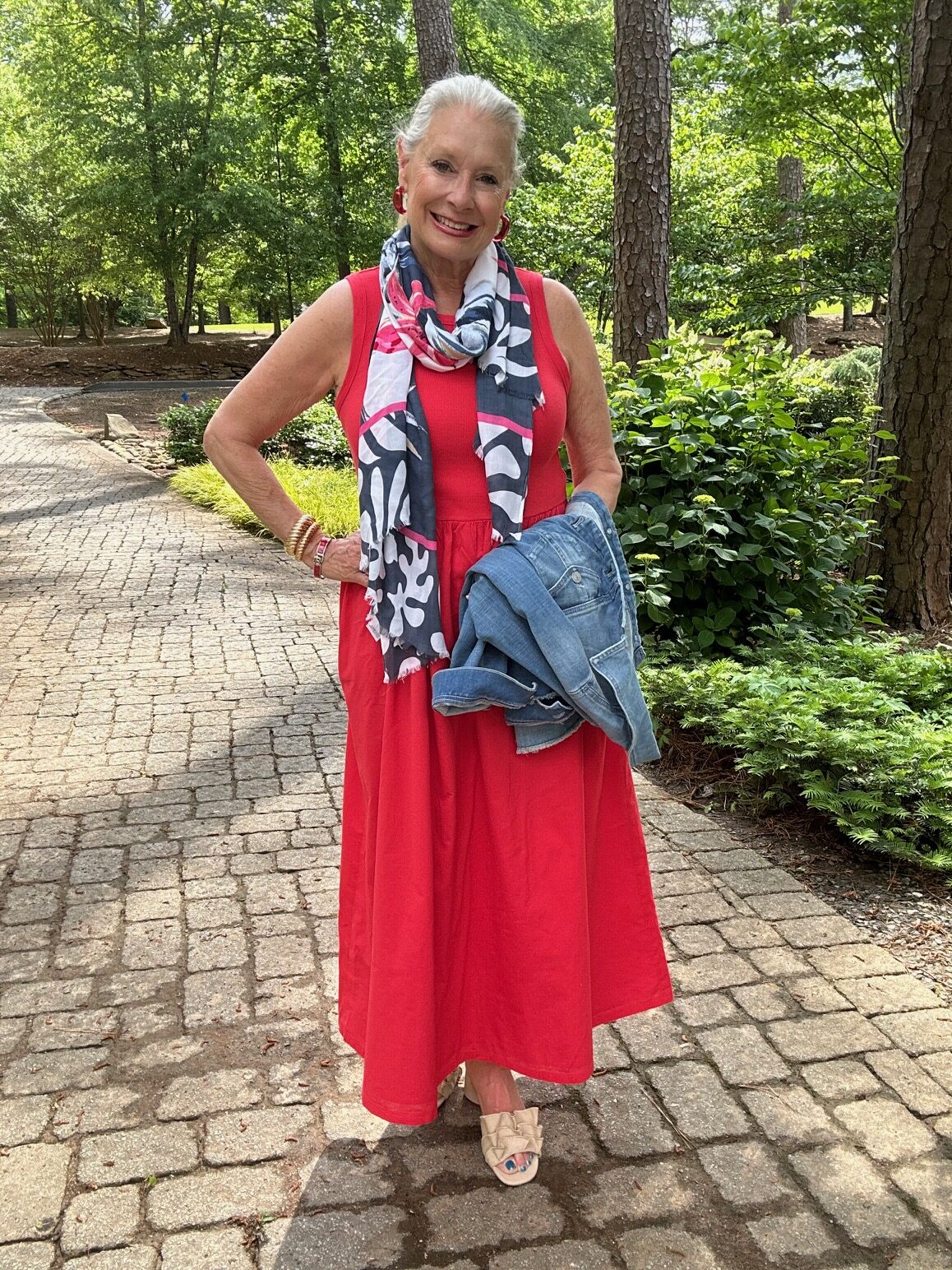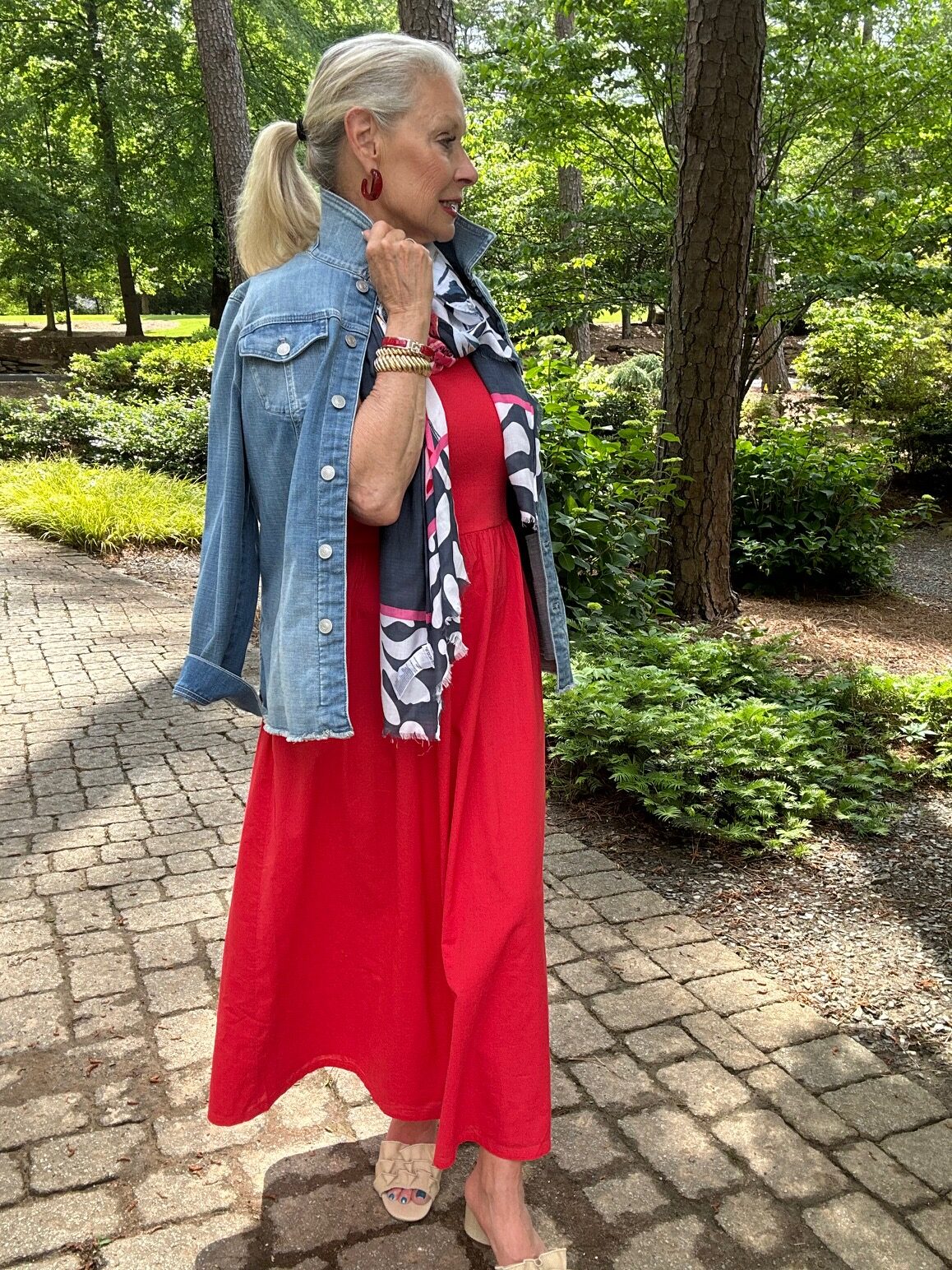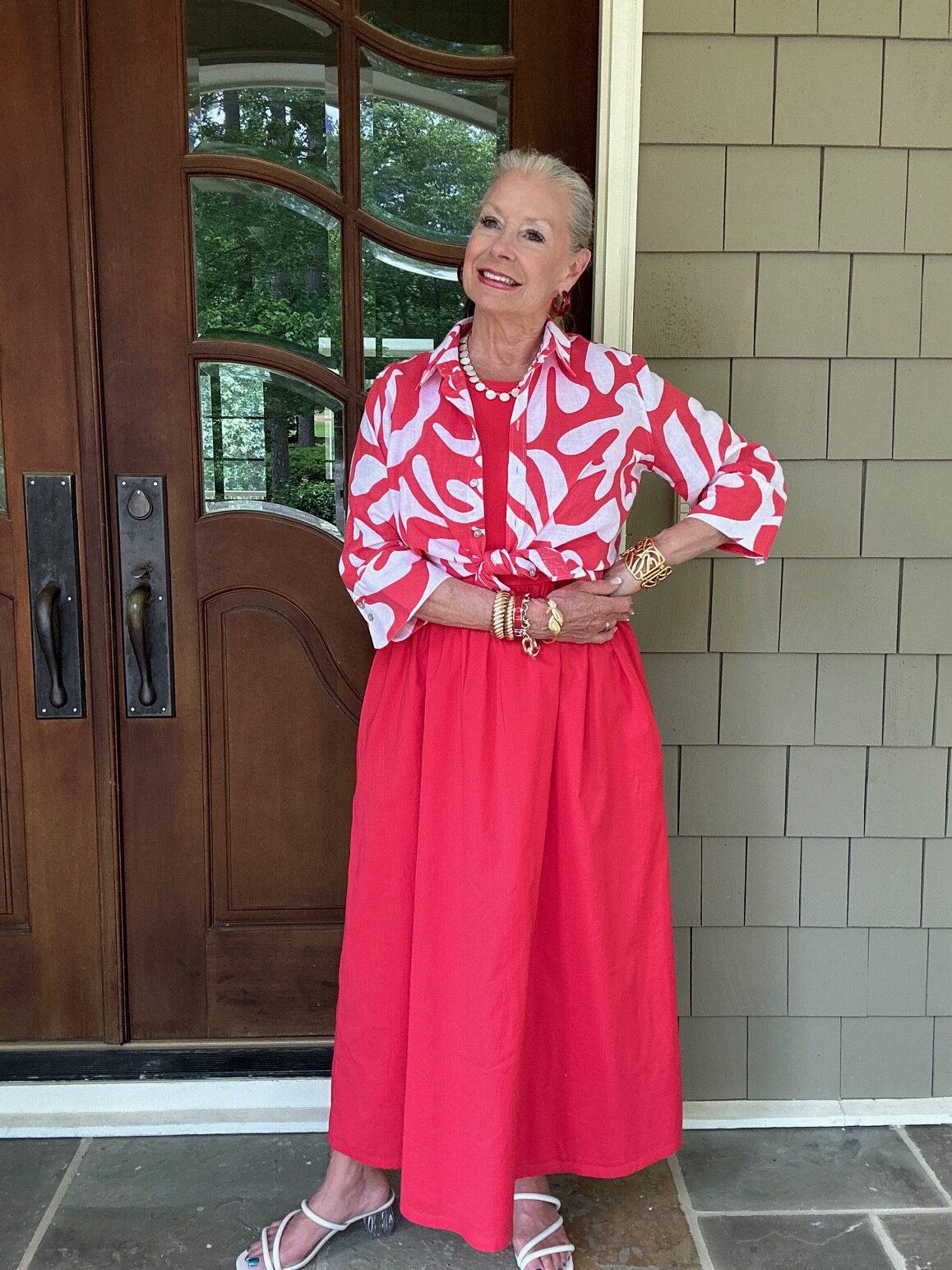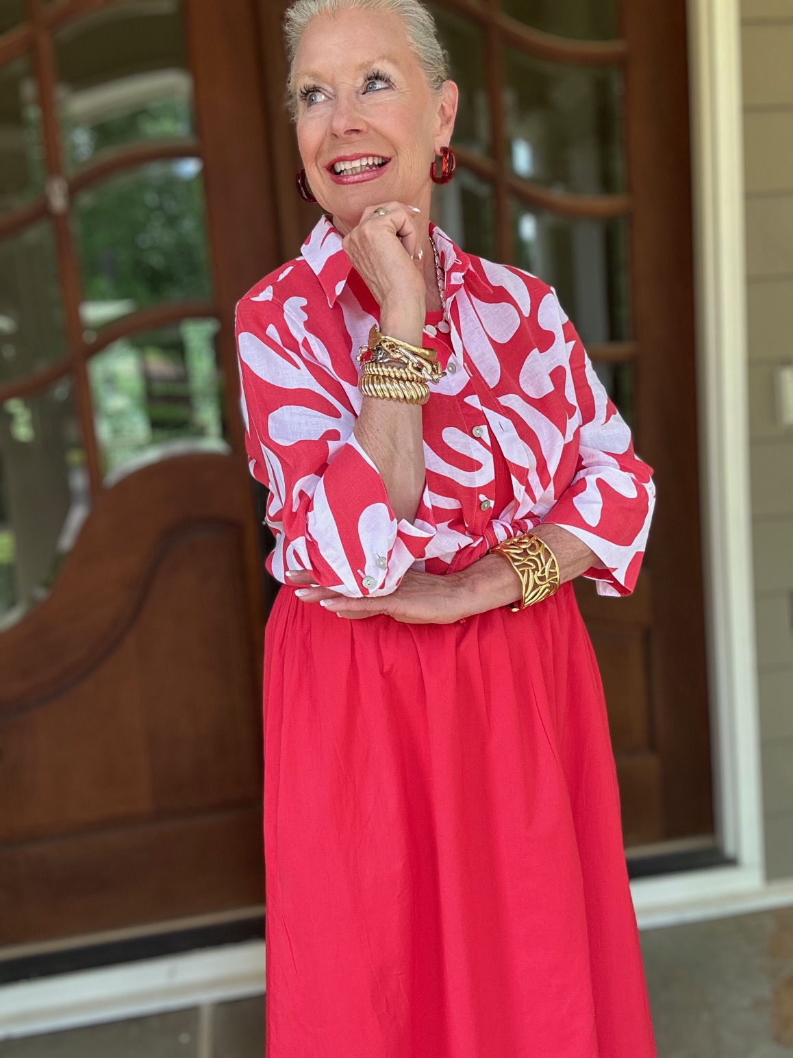 I styled Chico’s Fit & Flare Tank Maxi Dress in watermelon punch with the No Iron™ Linen Reef 3/4 Sleeve Shirt as the extra layer. This shirt only comes in watermelon punch, and the tank dress comes in navy, too. This outfit is perfect for a special occasion, a summer outdoor wedding, or any occasion you feel like dressing up.