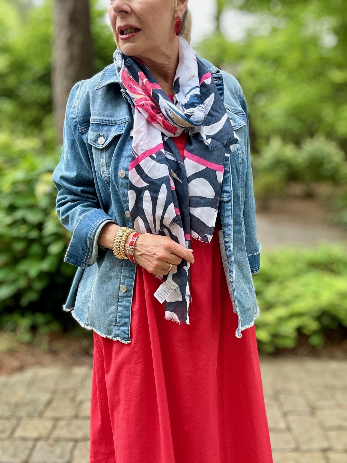 This time, I added the Indigo Frayed Hem Denim Jacket as my extra layer. This jacket is now my favorite denim jacket! I am also wearing the Silk Blend Floral Oblong Scarf.