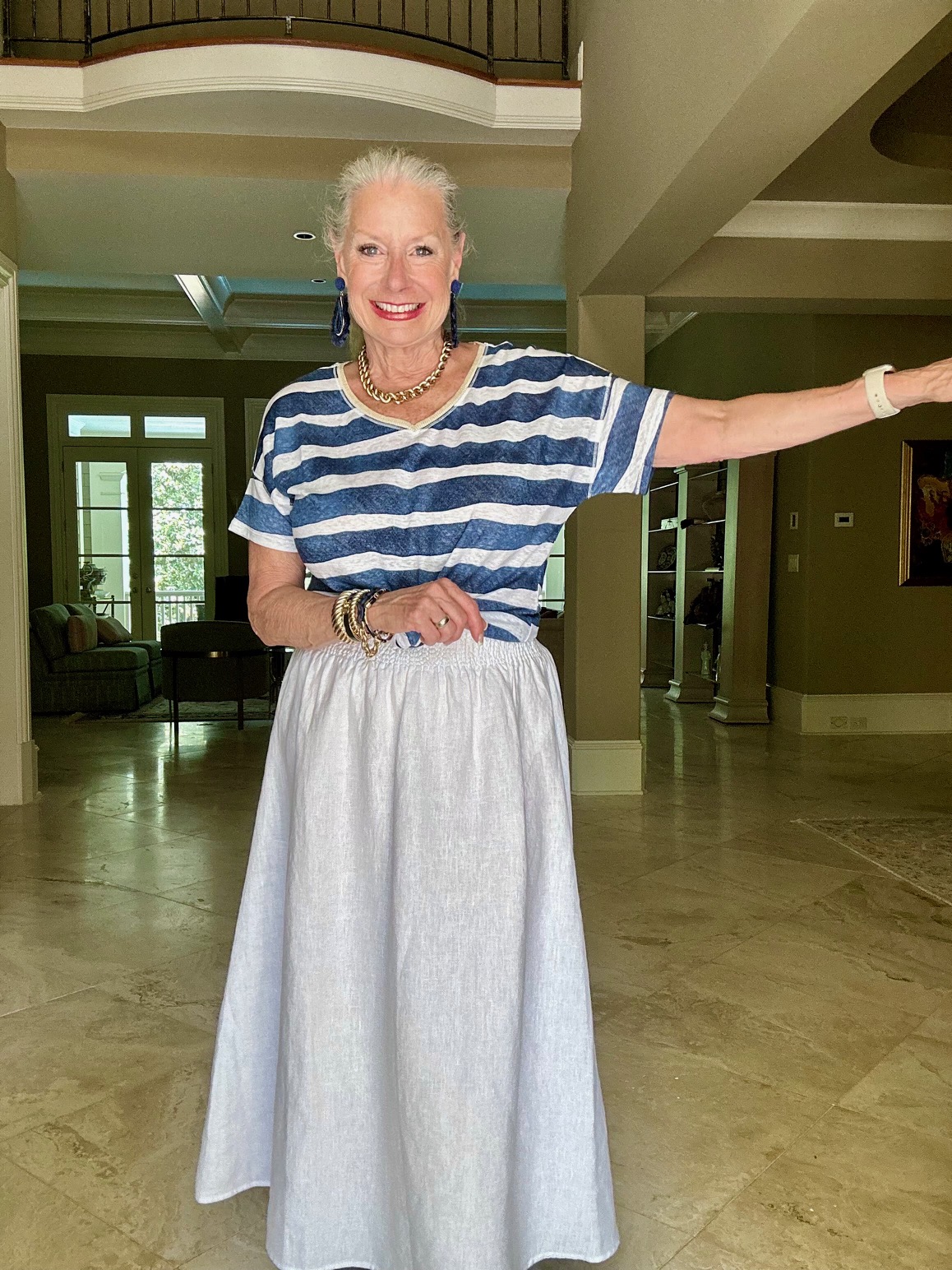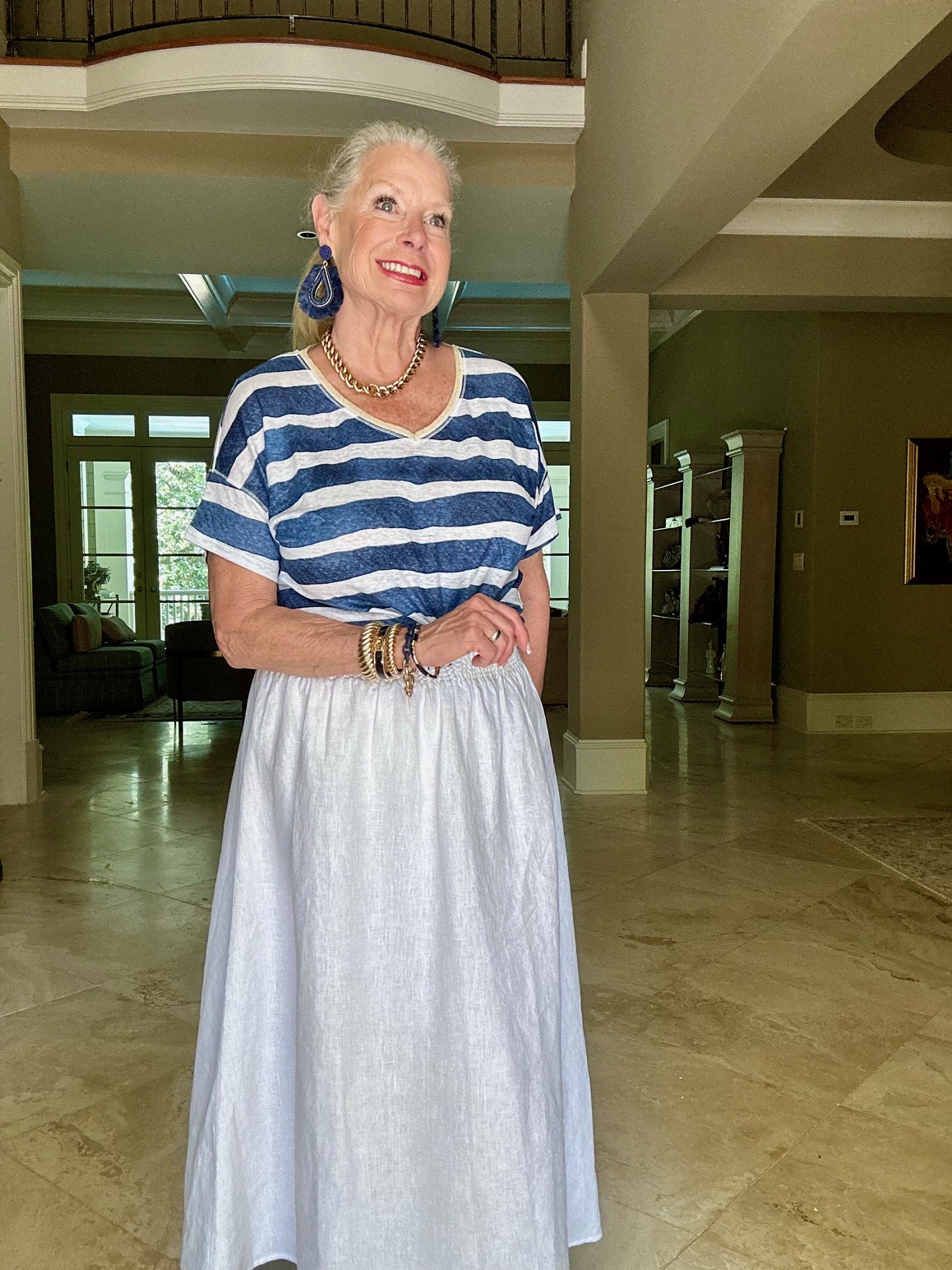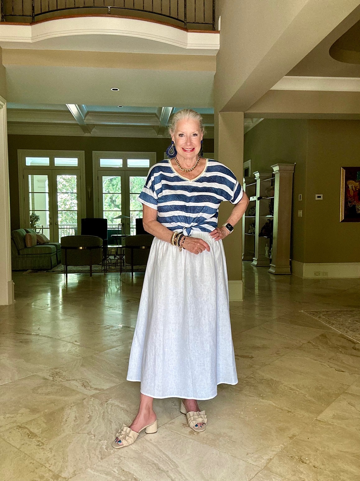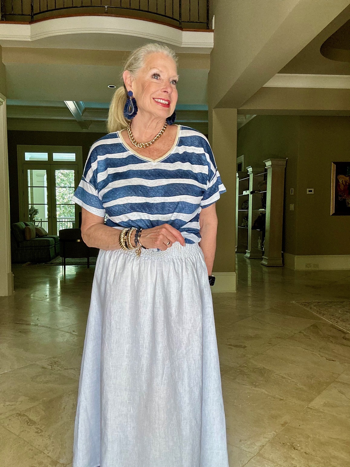 Here’s another great outfit for a summer soiree. The Navy Stripe Sweater Trim Linen Tee with the Linen A-line Midi Skirt is perfect for any evening event, bridal shower, or summer outdoor wedding you may have. In fact, I will be writing more about how to wear the linen midi skirt for your next event.