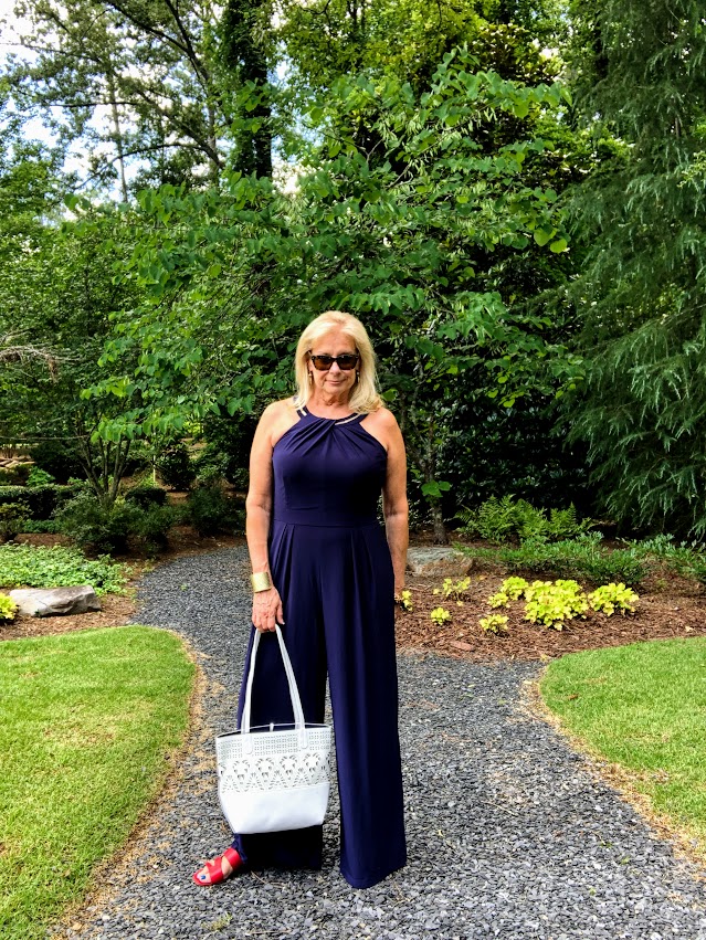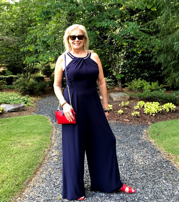 Love the halter style of the jumpsuit Robin and this s such a chic look . Love it with the wrap and the colors are perfect for the 4th. I love the laser etched bag, very pretty!