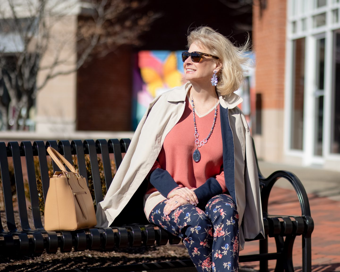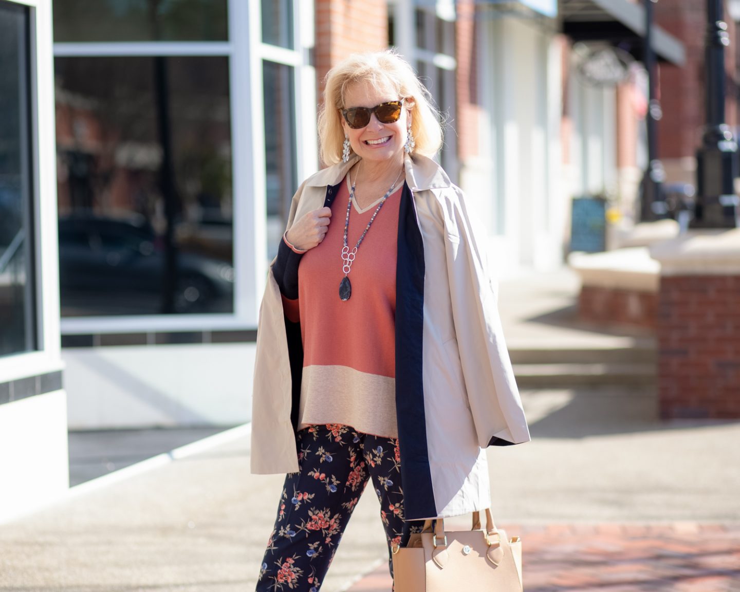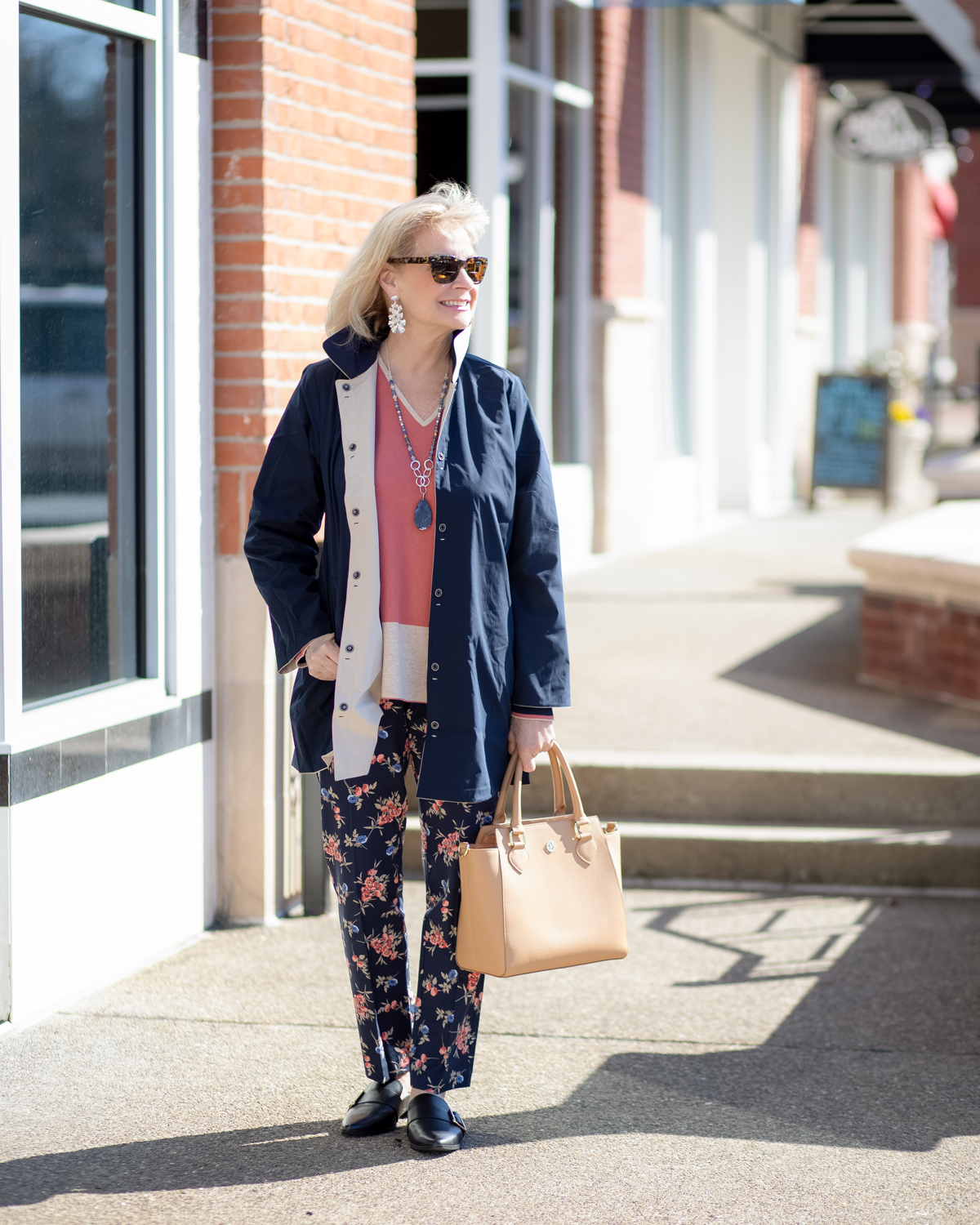 I am wearing a reversible color block V-neck sweater in a medium and the floral precision stretch slim leg pants. The pants will get a lot of use this year because of the timeless style and dark floral print. I purchased two other tops to go with the floral pants which I will share later. The navy floral pants can be worn with so many of the tops I have in my closet. I tried on both an 8 and a 10 in the pants and went for the roomier 10. ( I am working on getting back into roomier 8’s!!)