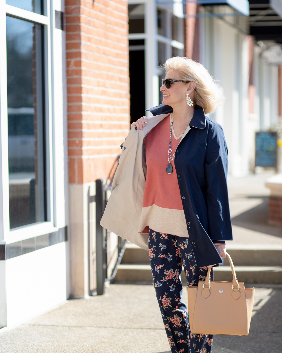 Beautiful outfit on you Robin. I love the peach color with your complexion ! Navy and peach look so fresh !also love the reversible jacket, it will be very useful and it looks chic!