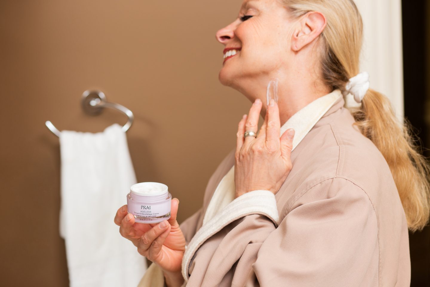 There are exercises, surgical options, injections, and nonsurgical creams like PRAI Beauty AGELESS collection to help firm and smooth our aging neckline.