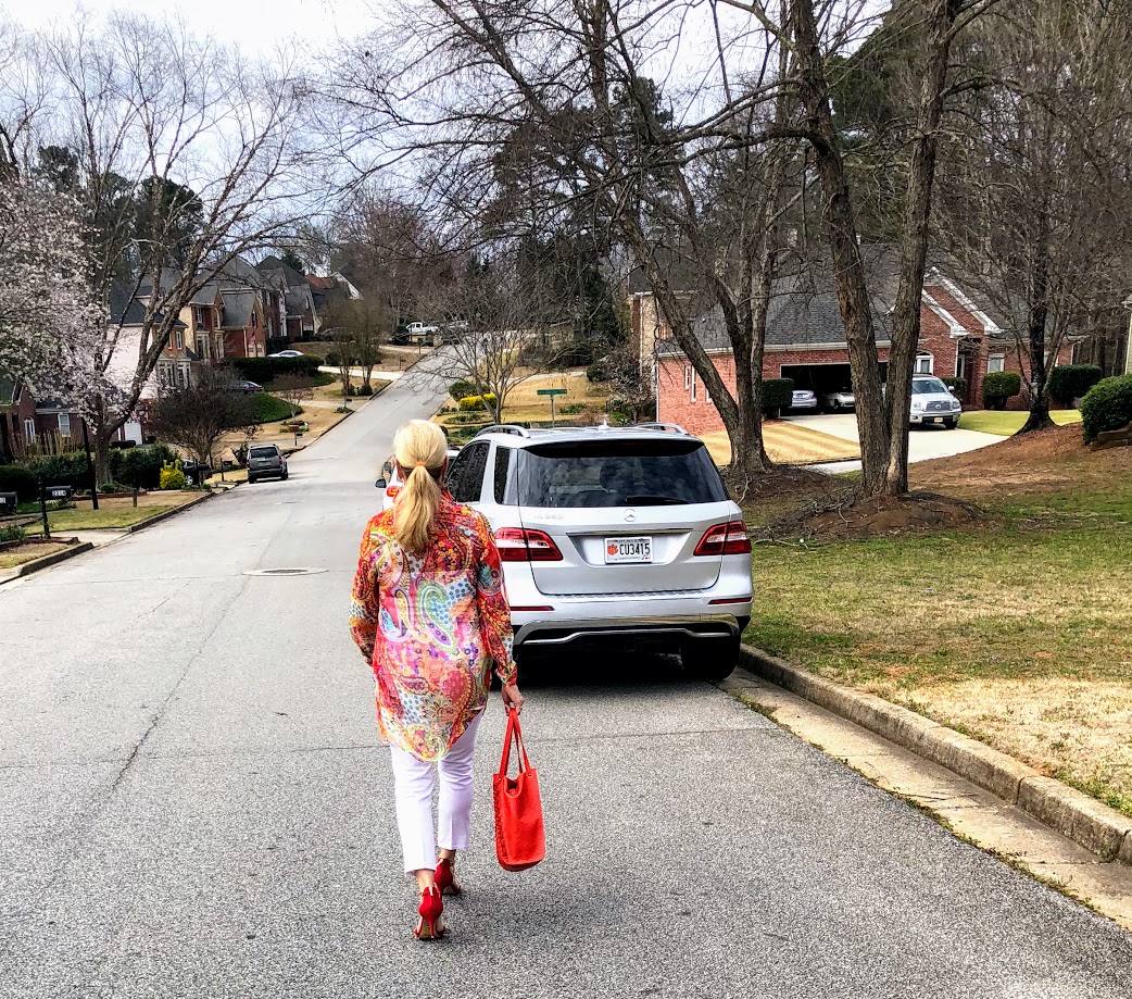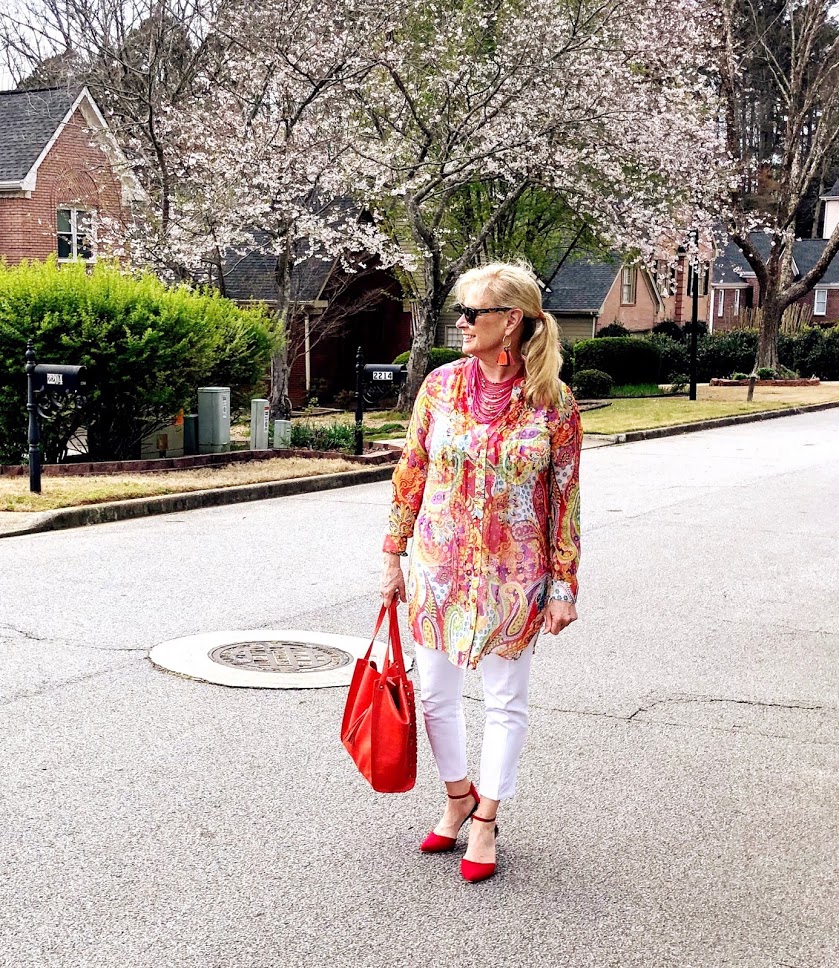 This paisley tunic top is sheer but it comes with a white camisole. I pulled out of my closet my white pants from last spring, pink layered necklace, orange and red tassel earrings also from last spring. I wore red heels and my red bag for a pop of red.