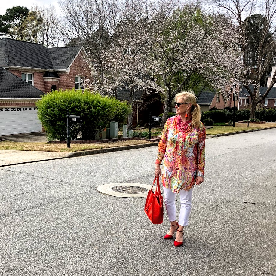 This paisley tunic top is sheer but it comes with a white camisole. I pulled out of my closet my white pants from last spring, pink layered necklace, orange and red tassel earrings also from last spring. I wore red heels and my red bag for a pop of red.