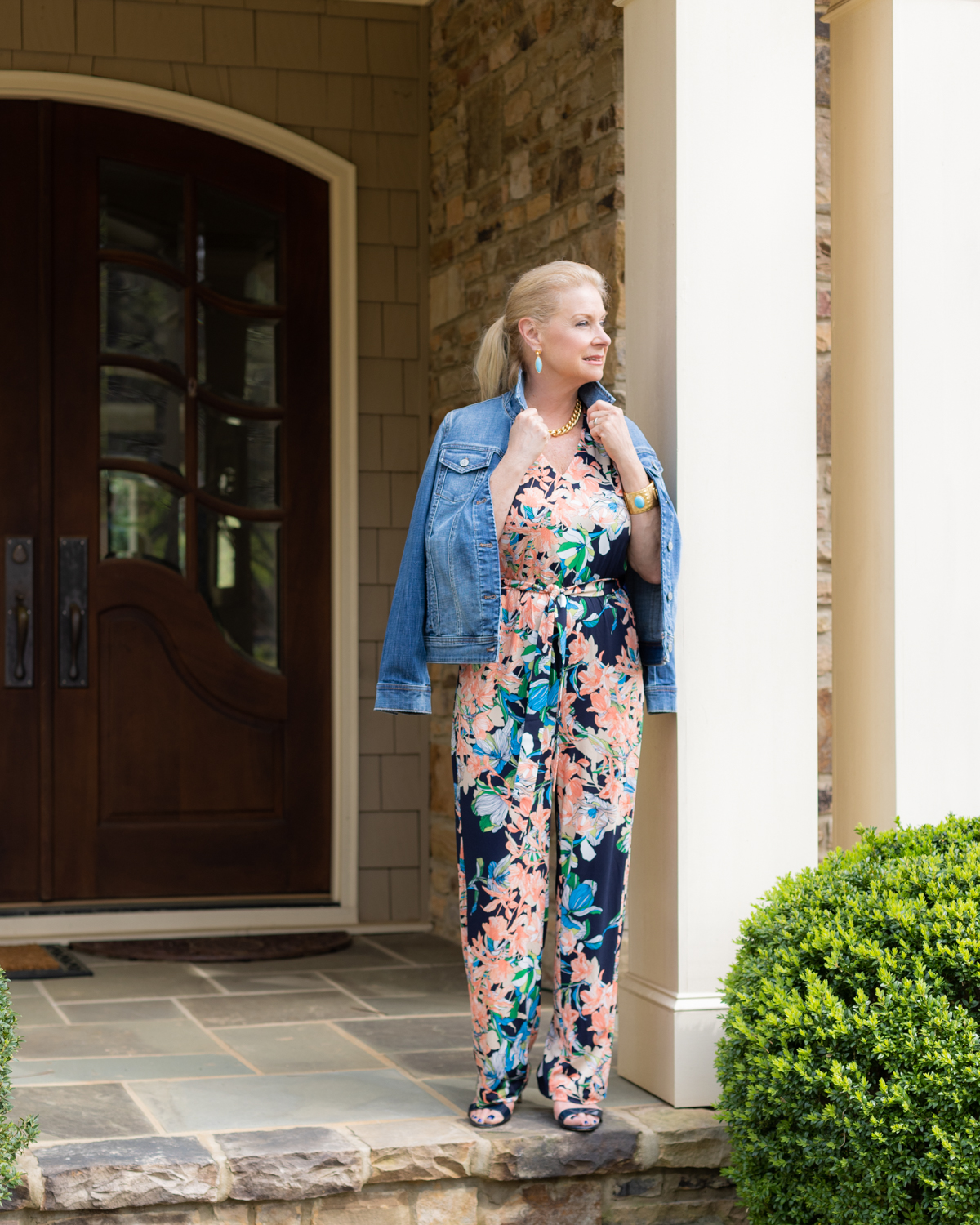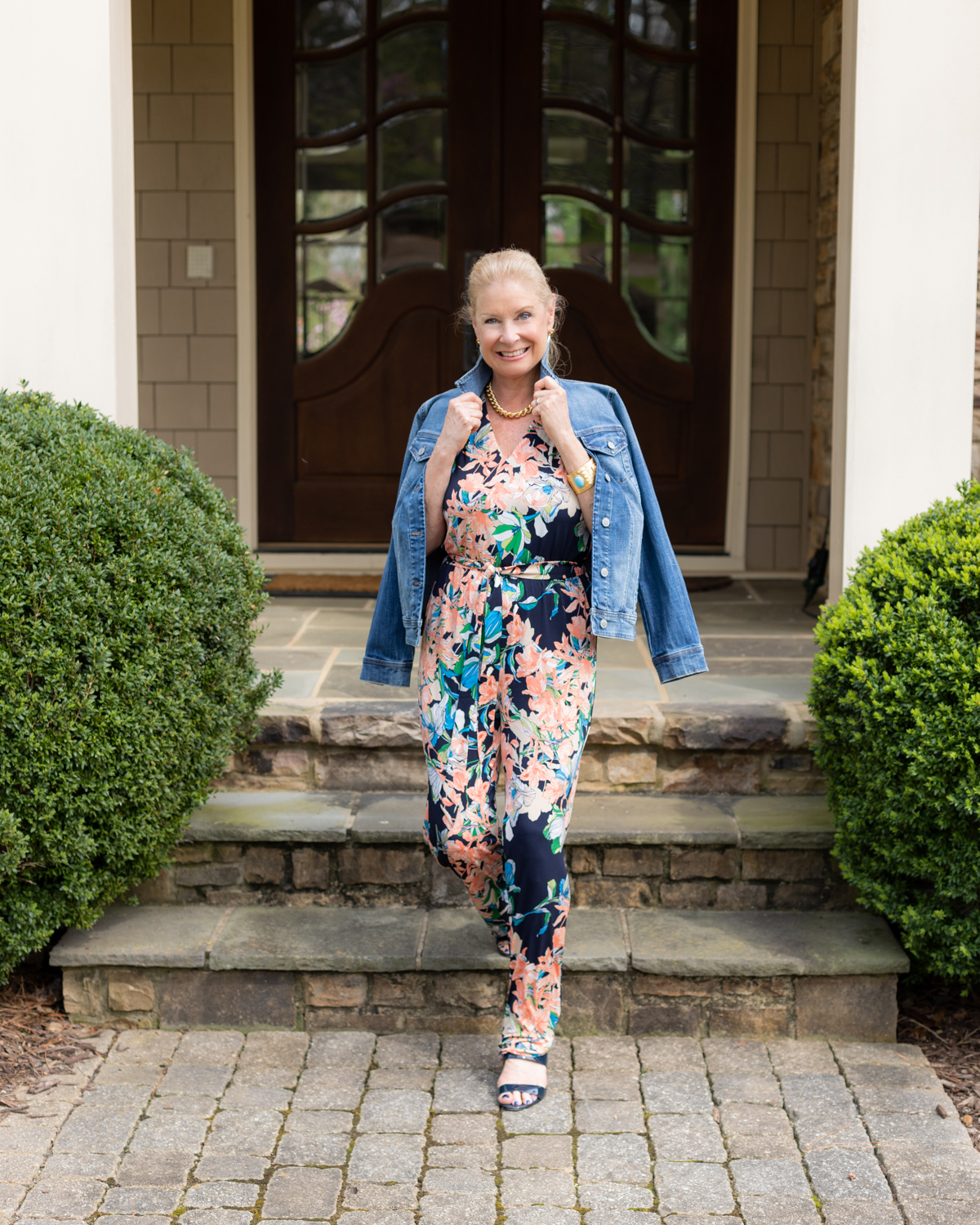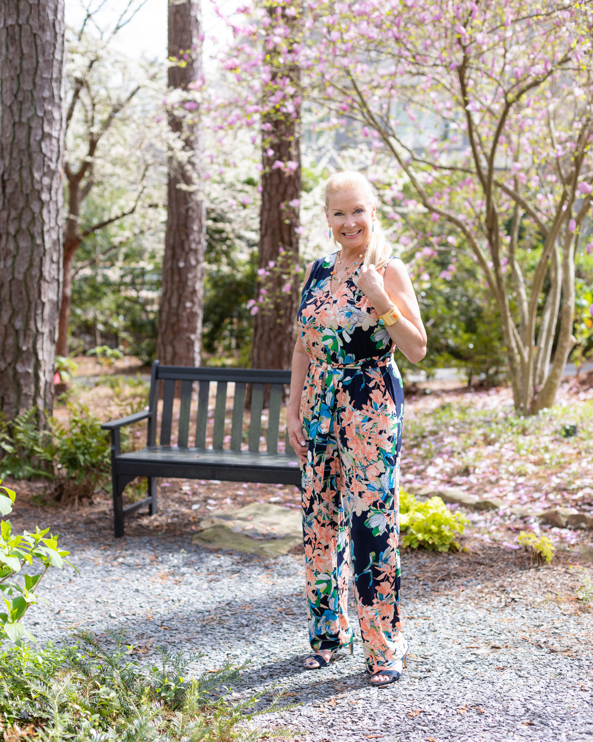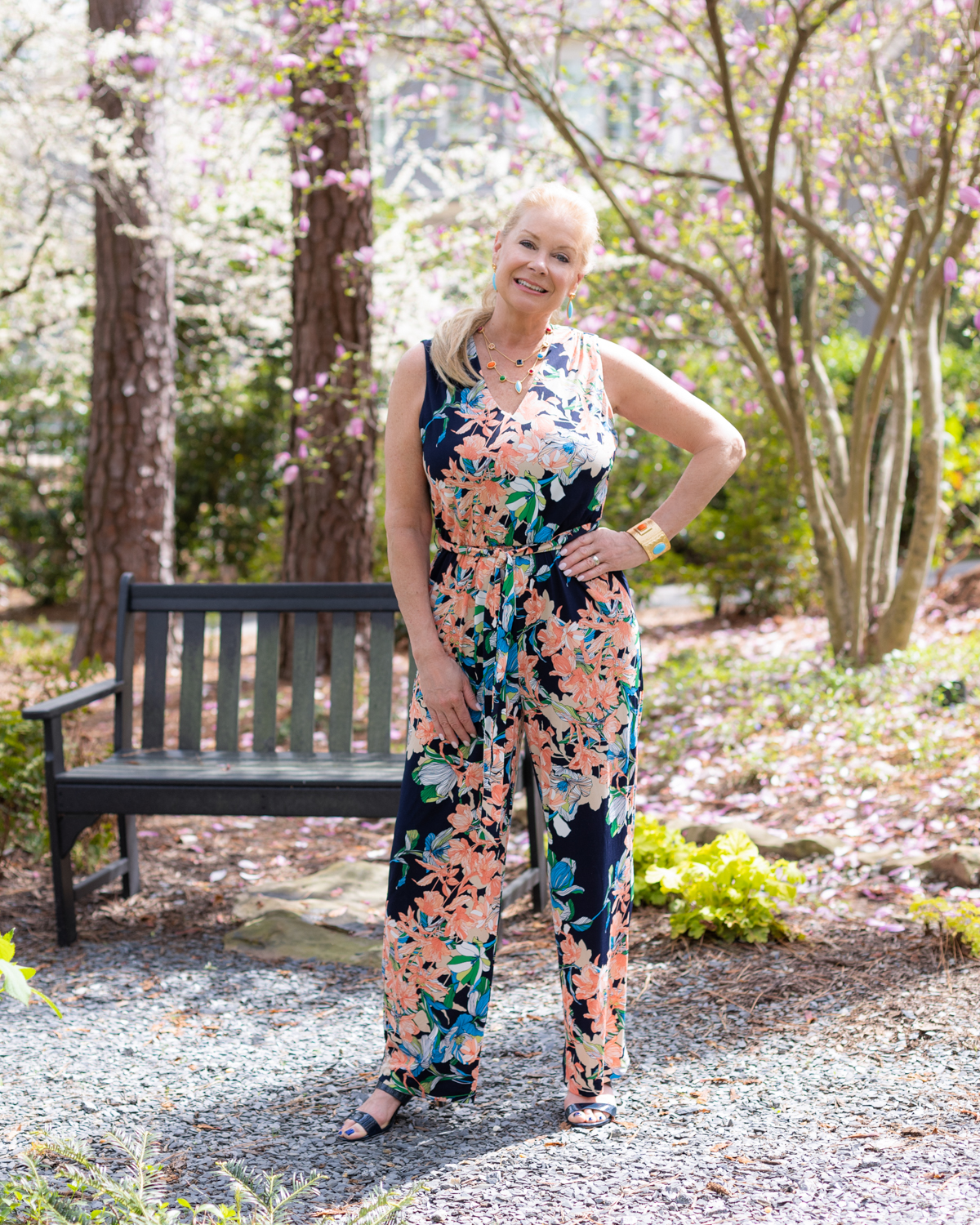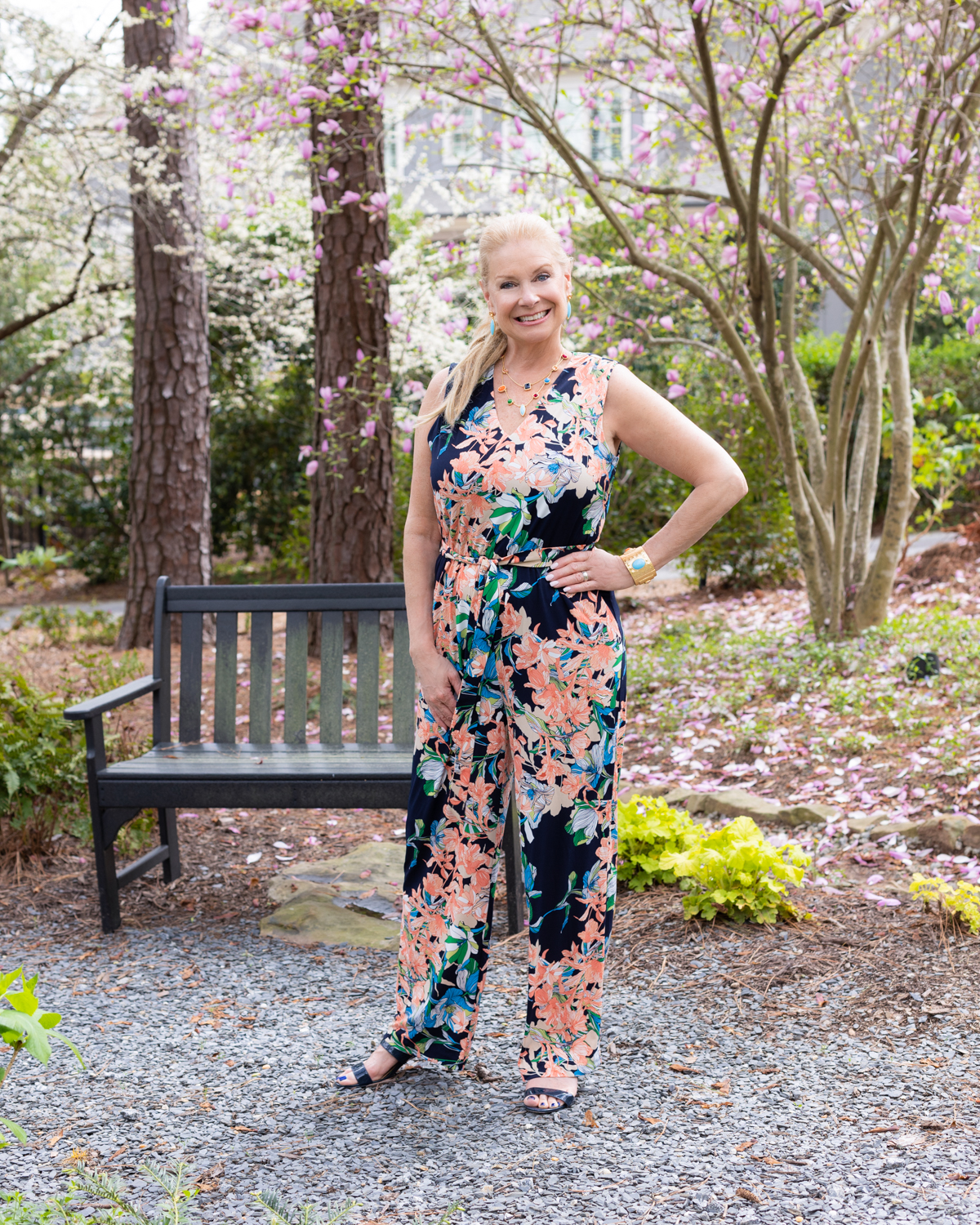 Ladies, I hope you had a wonderful weekend! I am so happy that we could spend Easter with our children and granddaughters. We had way too much to eat but it was such a joy to be with our family. Our family loves to celebrate birthdays and holidays together. This spring I have a couple of birthday celebrations for my granddaughters coming up as well as Mother’s Day. Since I have to attend these celebrations I was thinking of wearing a jumpsuit. I only have a couple of jumpsuits in my wardrobe that are solid print. I really love this floral jumpsuit from Chico’s Spring Collection.