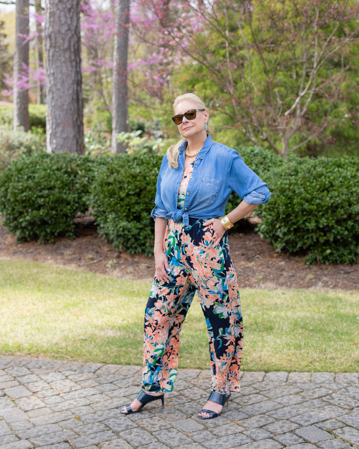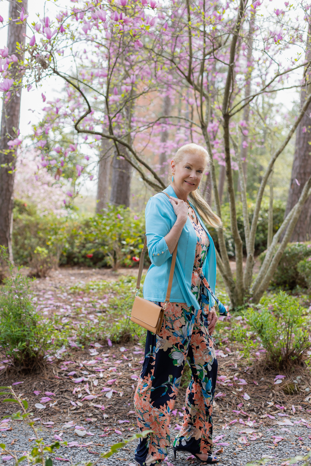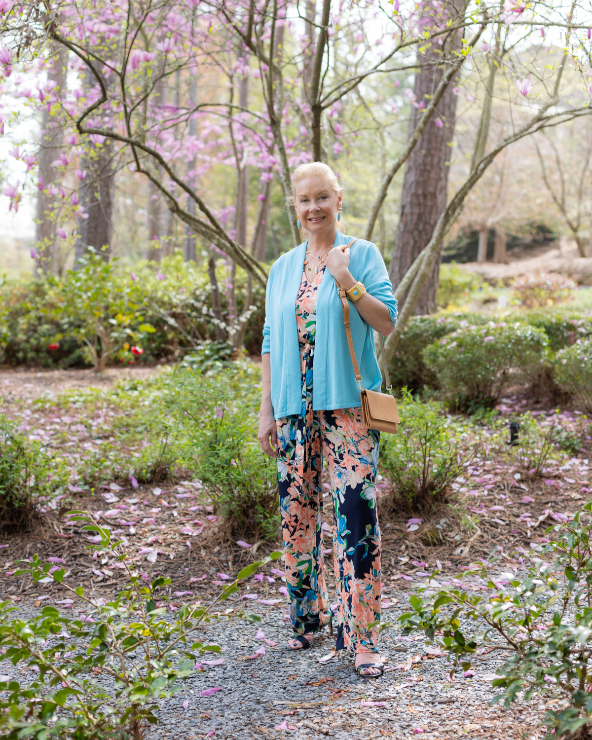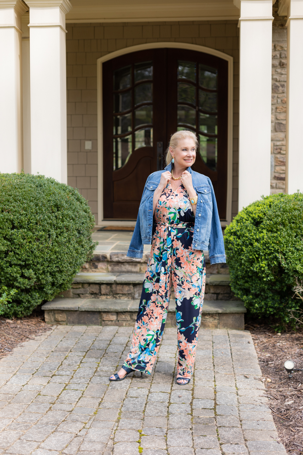 Ladies, I hope you had a wonderful weekend! I am so happy that we could spend Easter with our children and granddaughters. We had way too much to eat but it was such a joy to be with our family. Our family loves to celebrate birthdays and holidays together. This spring I have a couple of birthday celebrations for my granddaughters coming up as well as Mother’s Day. Since I have to attend these celebrations I was thinking of wearing a jumpsuit. I only have a couple of jumpsuits in my wardrobe that are solid print. I really love this floral jumpsuit from Chico’s Spring Collection.