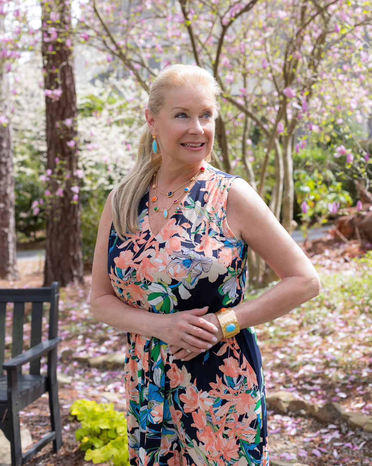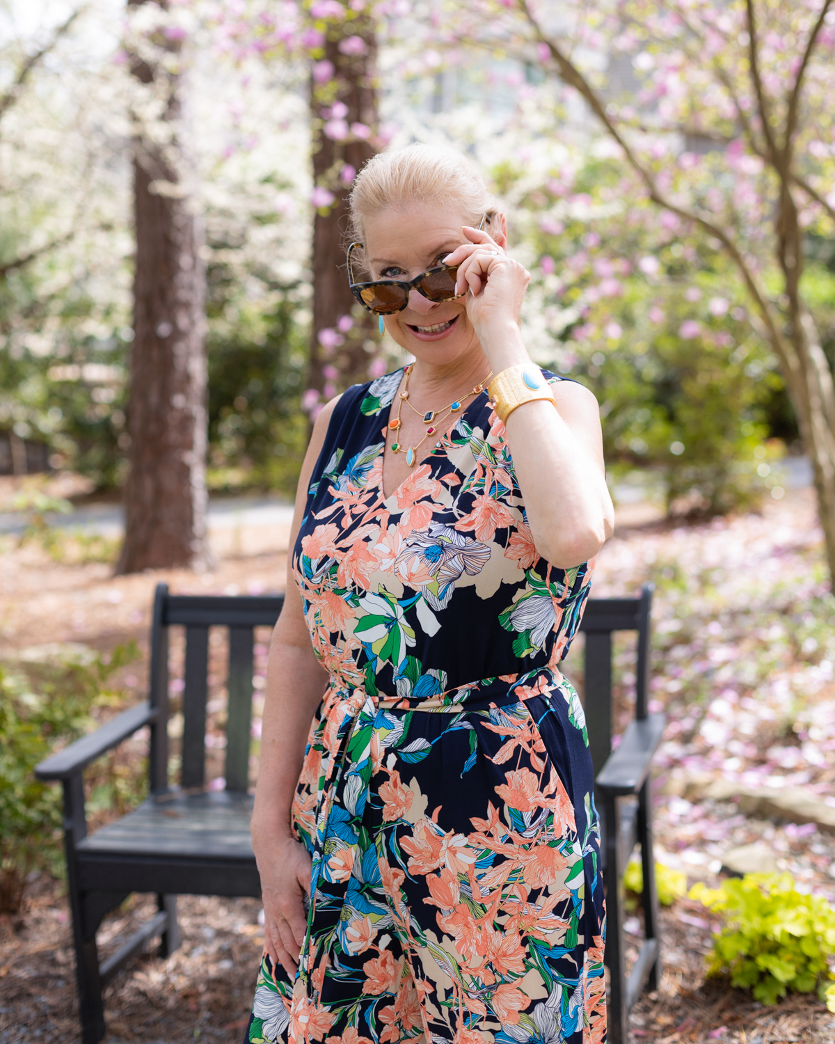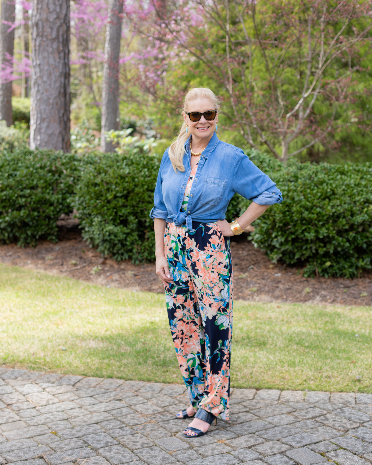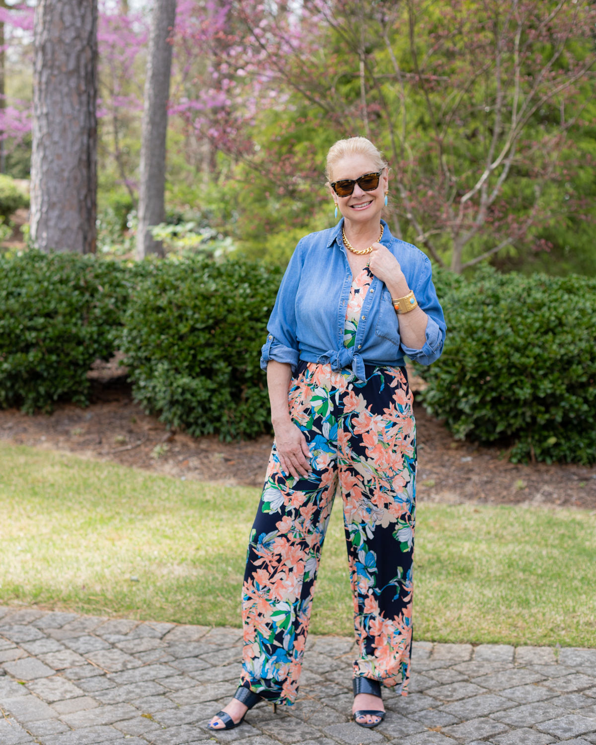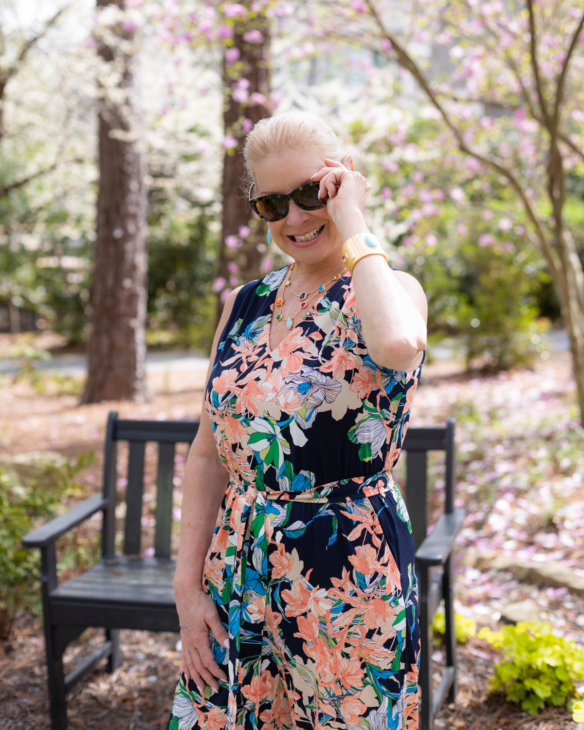 Ladies, I hope you had a wonderful weekend! I am so happy that we could spend Easter with our children and granddaughters. We had way too much to eat but it was such a joy to be with our family. Our family loves to celebrate birthdays and holidays together. This spring I have a couple of birthday celebrations for my granddaughters coming up as well as Mother’s Day. Since I have to attend these celebrations I was thinking of wearing a jumpsuit. I only have a couple of jumpsuits in my wardrobe that are solid print. I really love this floral jumpsuit from Chico’s Spring Collection.
