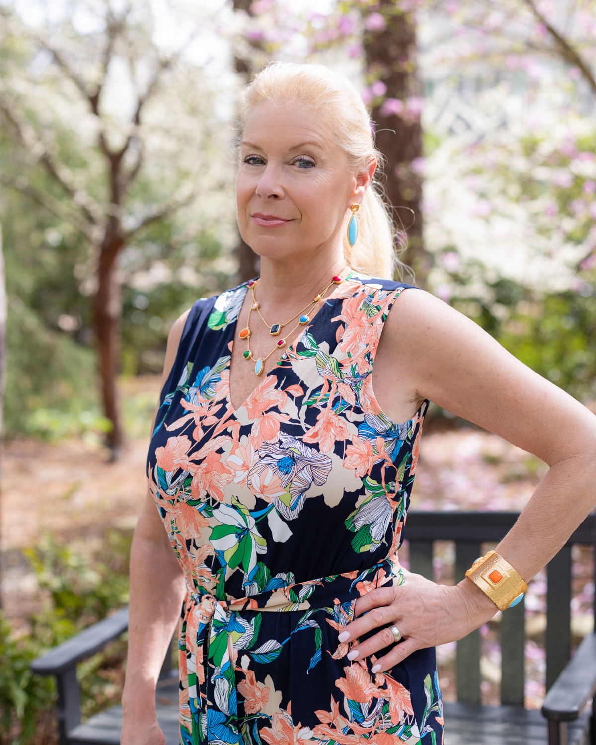 I am such a big fan of Chico’s jewelry! You will always find me wearing Chico’s jewelry year after year. I selected the Multi-Stone Illusion Necklace, the Wide Cuff Multi-Stone Stretch Bracelet, and the Multi-Stone Linear Earrings to go with the floral jumpsuit.