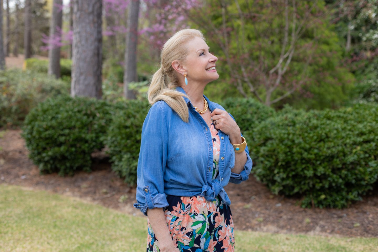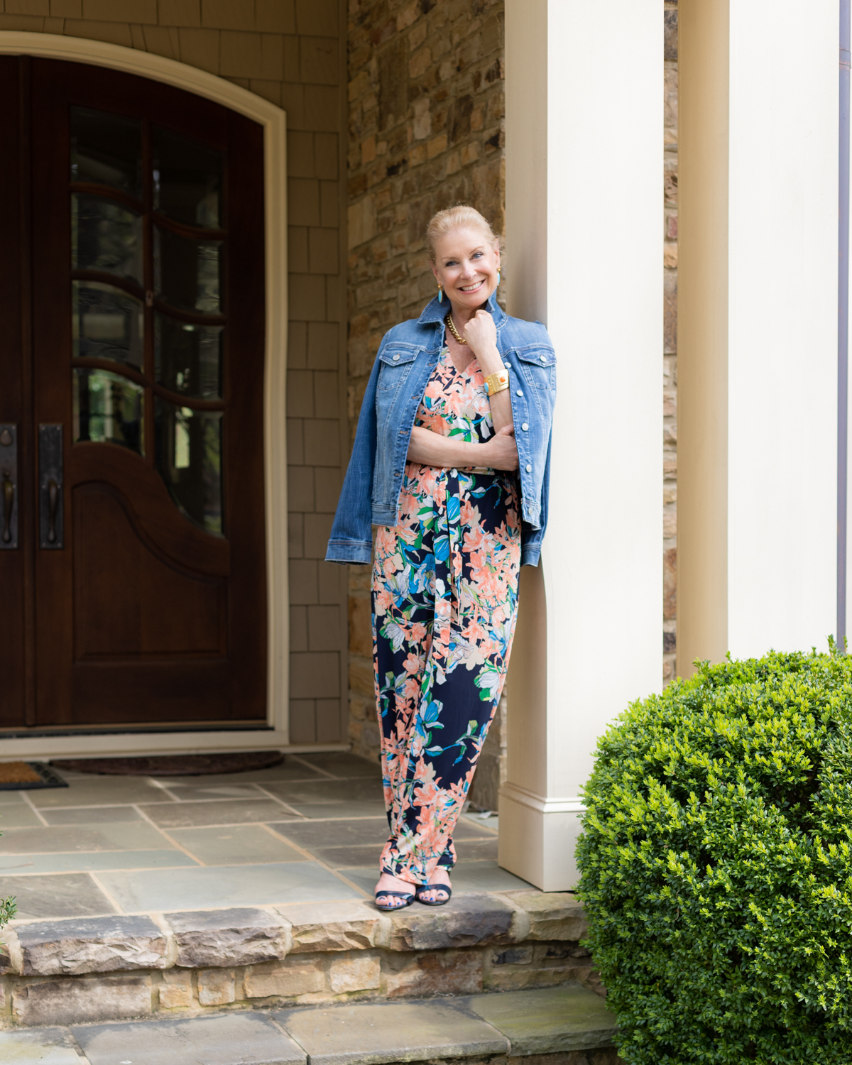If you don’t own a denim jacket now is the time to add one to your wardrobe! Denim jackets look fabulous on women over 50! This Denim Jacket is a workhorse in my closet! Chico’s also has a long Denim Jacket if you’re not a fan of cropped jackets. Either jacket works so well with the floral jumpsuit.