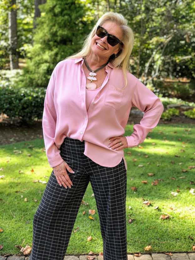 I already admired your beige plaid trousers, but the black ones with the pink blouse look stunning too!
