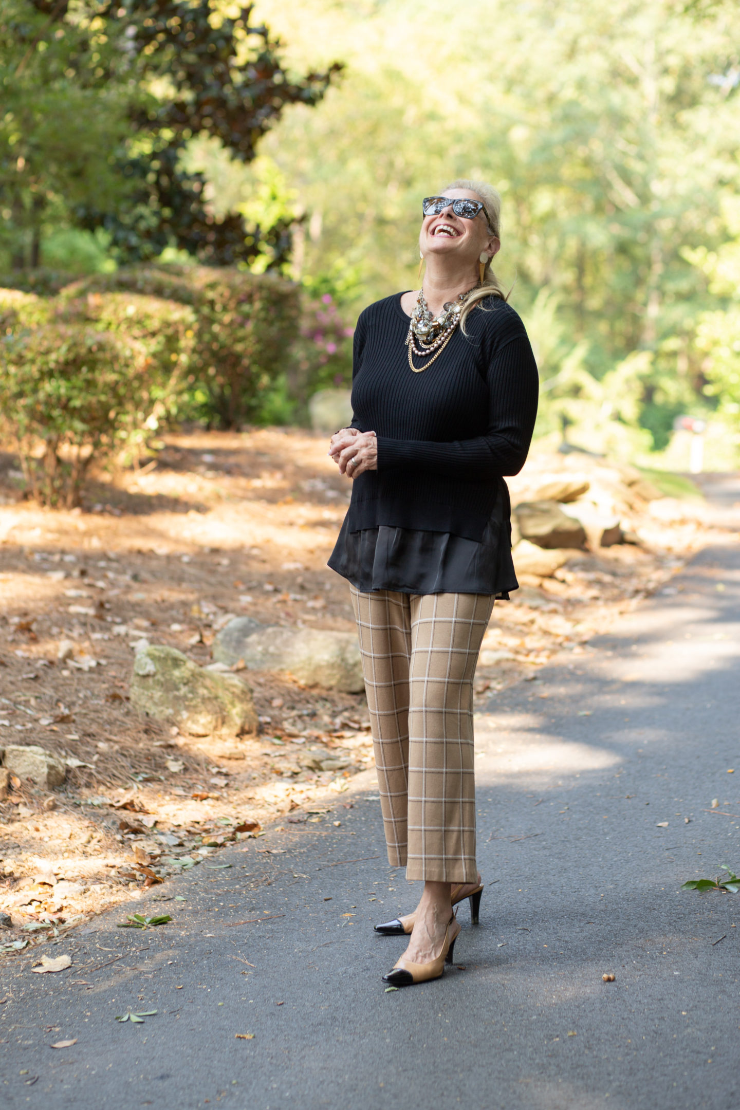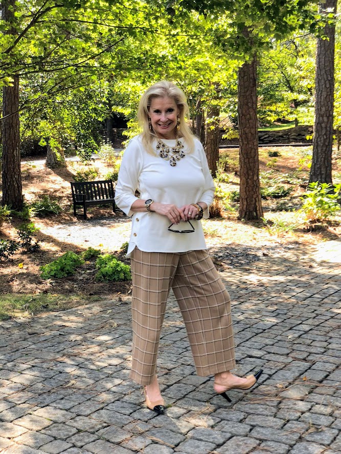 Here’s another way to wear my cropped wide-leg plaid pants. My leopard print jewelry looks wonderful with plaid. Read more about this look here.