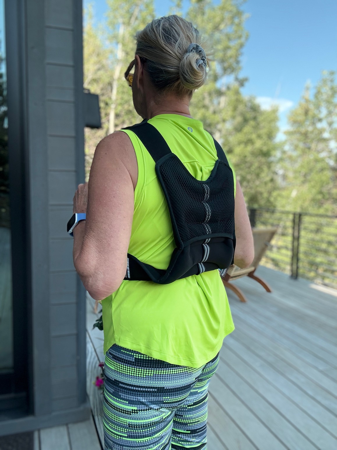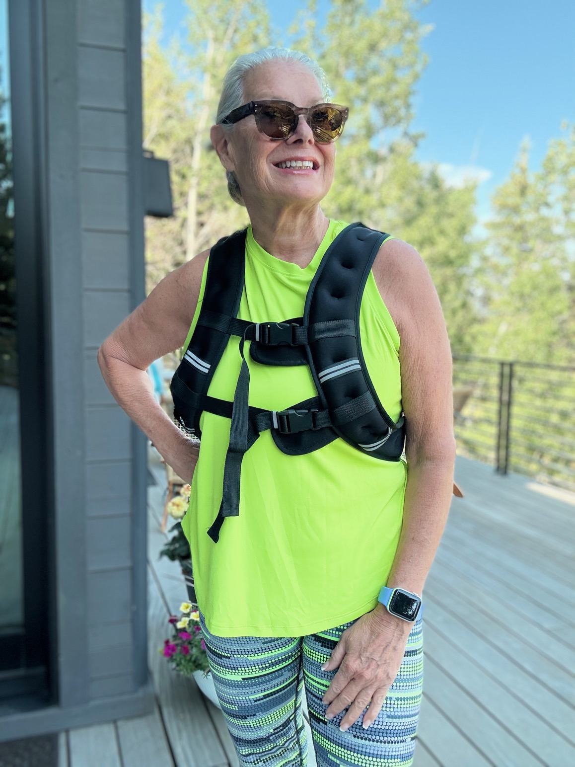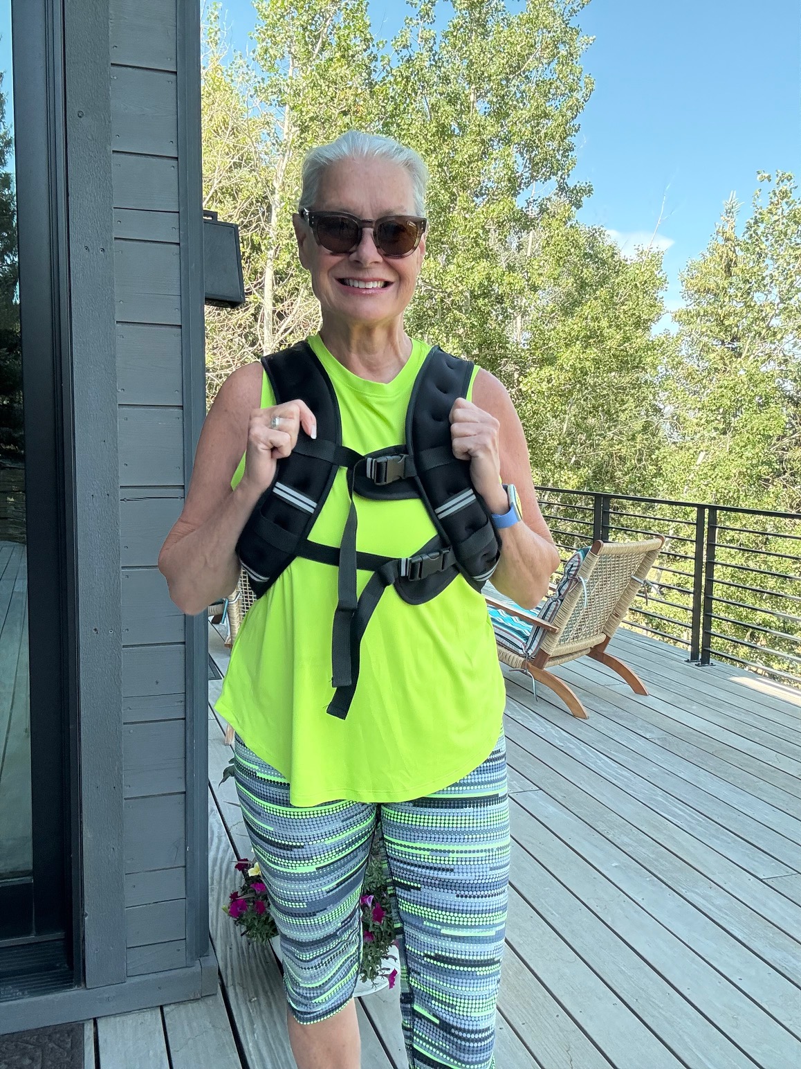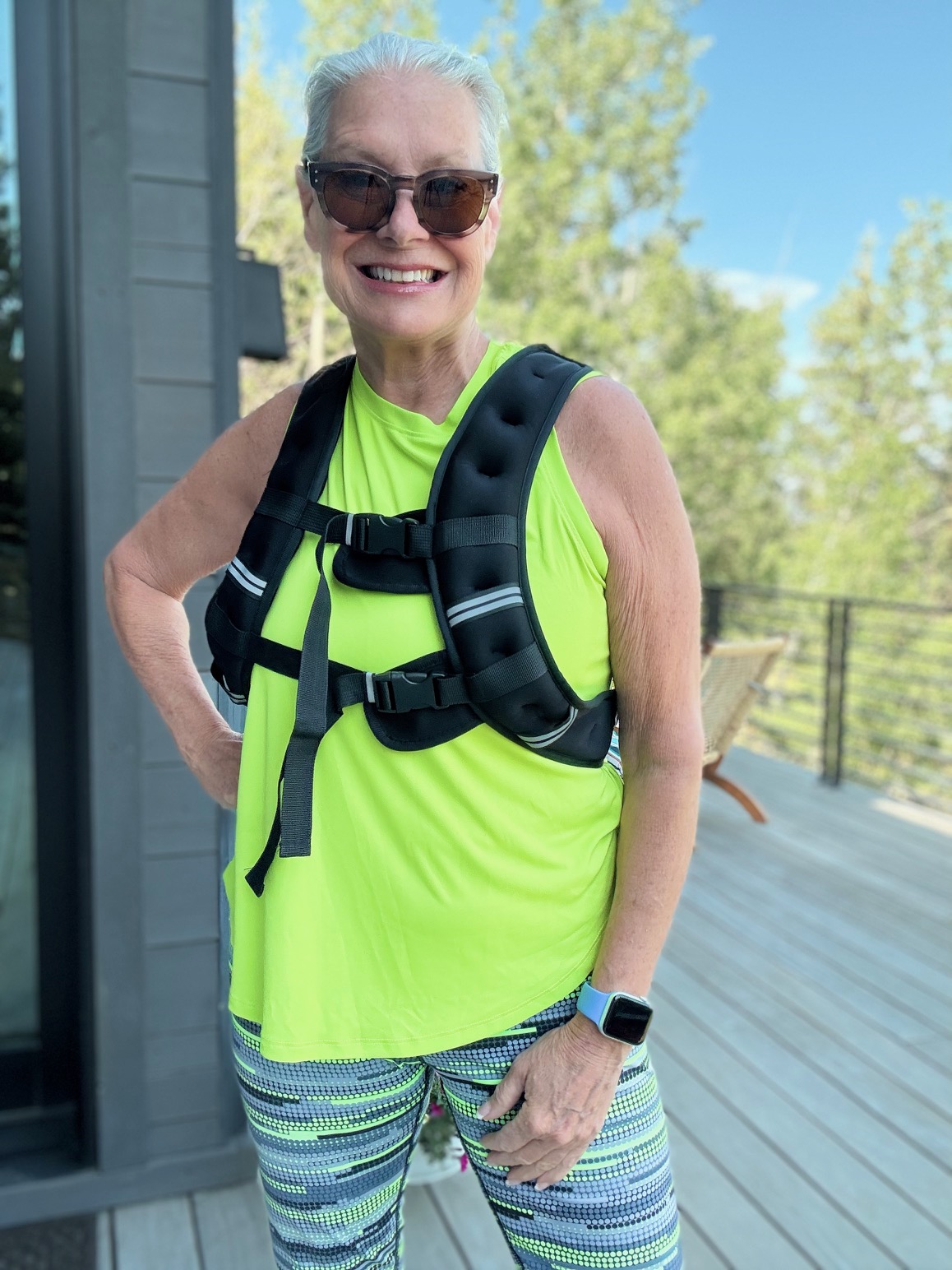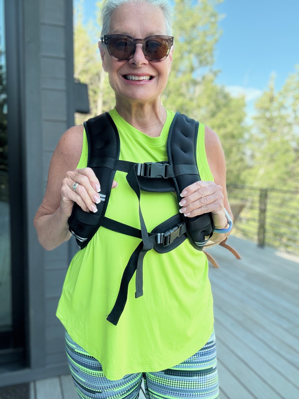 • Start light: To avoid injury, start with a low weight (5–10% of body weight). I started wearing an 8-lb weighted vest. I’m going to increase my weight to 15 pounds because I’ve become accustomed to carrying it when I walk and move around the house.