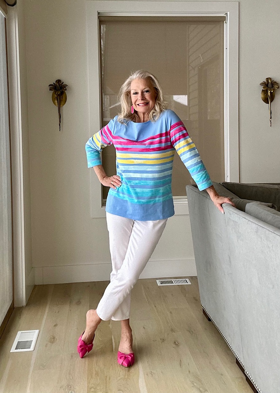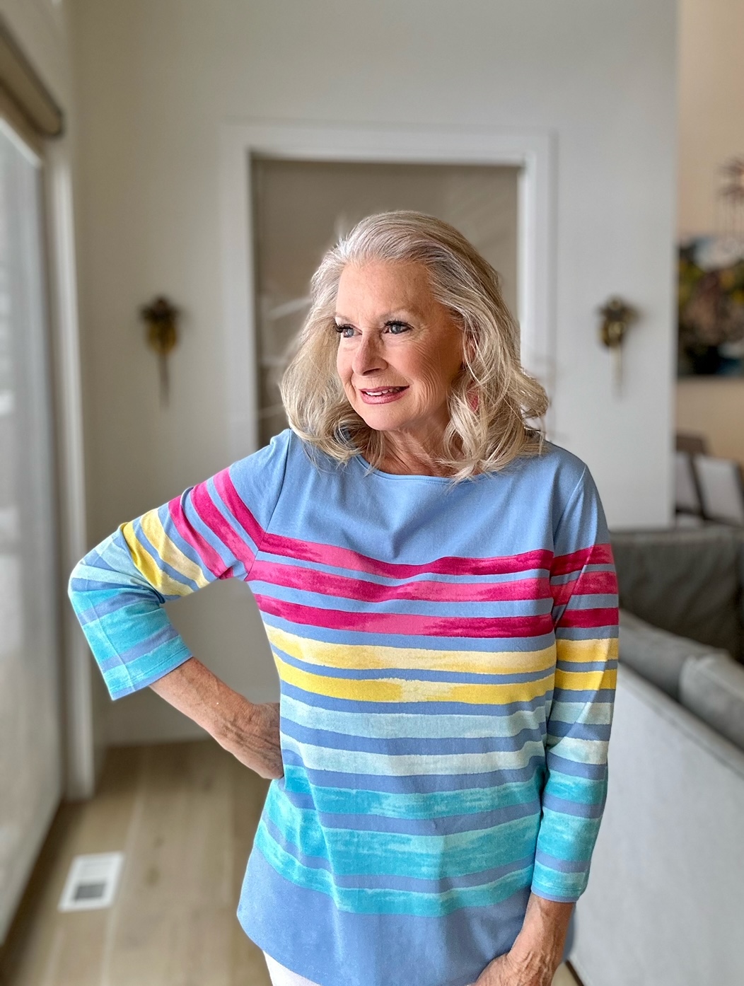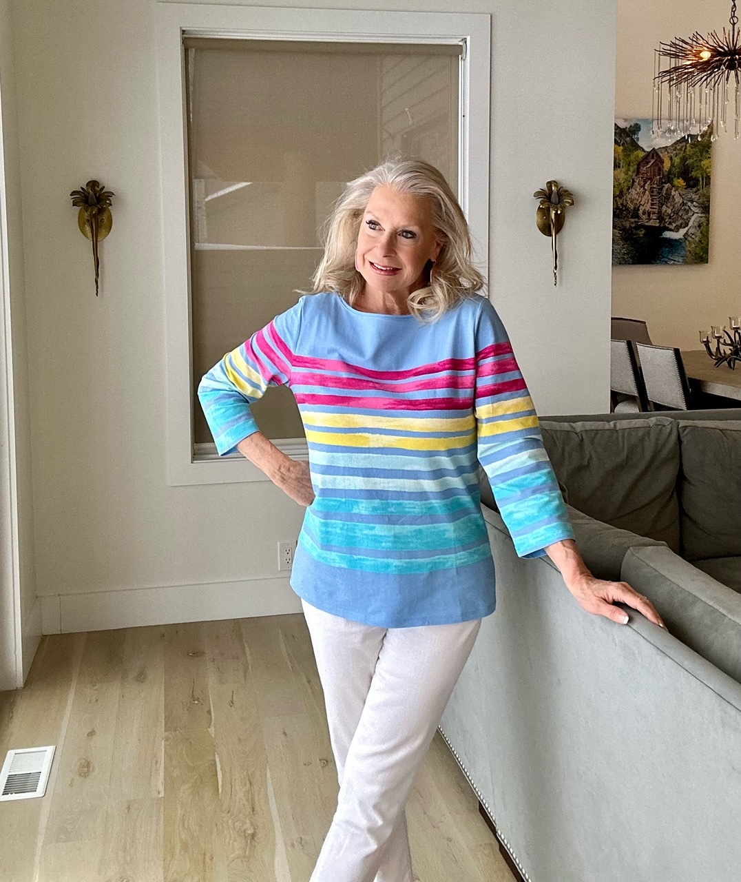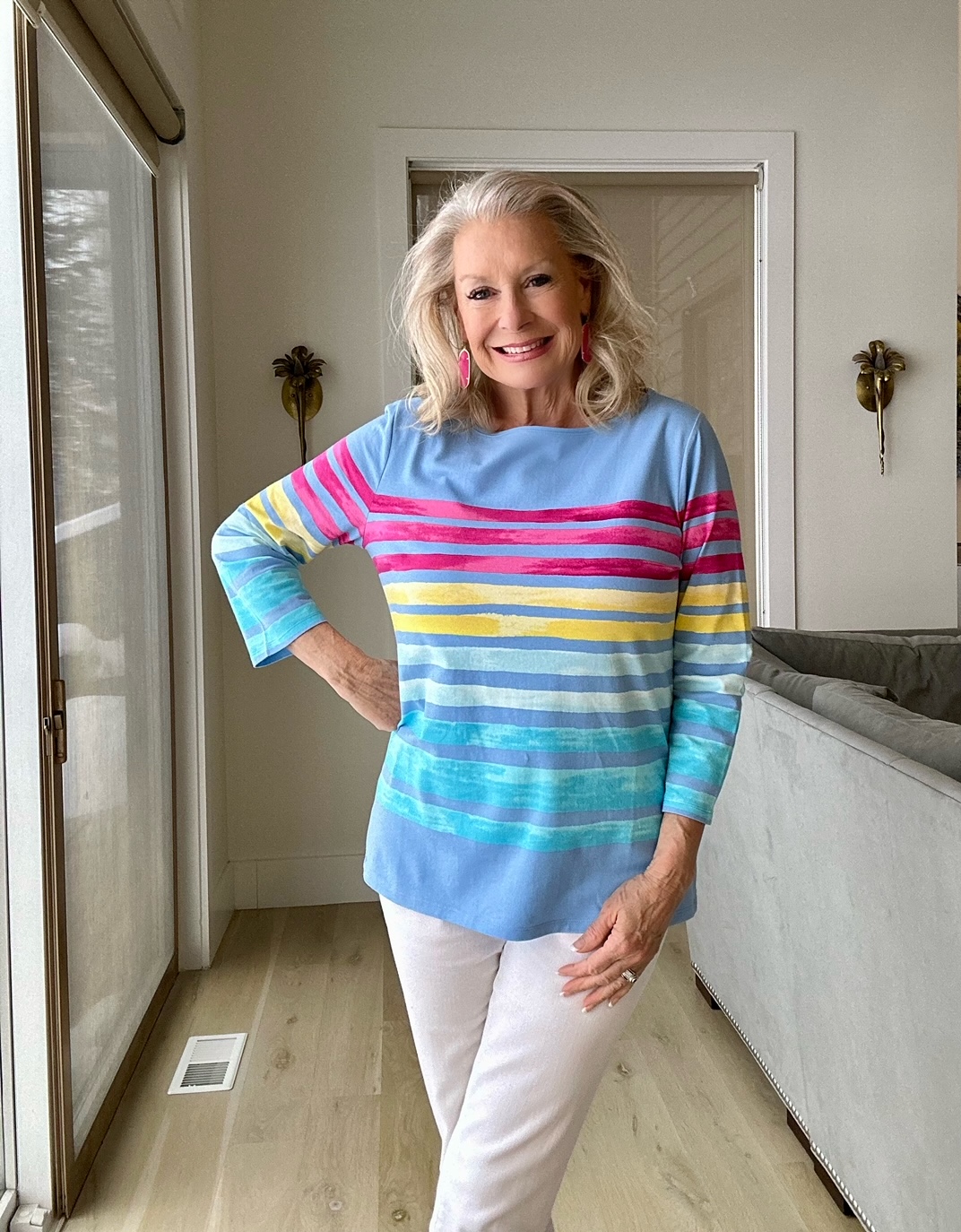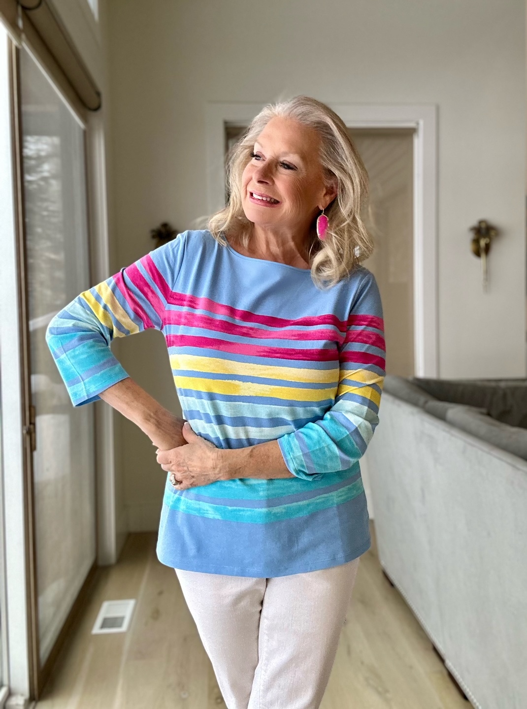 Ladies, if you’re looking for the perfect blue top for spring, this one checks all the boxes. In fact, when I posted this top on Instagram, I sold ten of the Bateau Neck Tee – Painted Stripes . It’s under $50.00 and so pretty on!