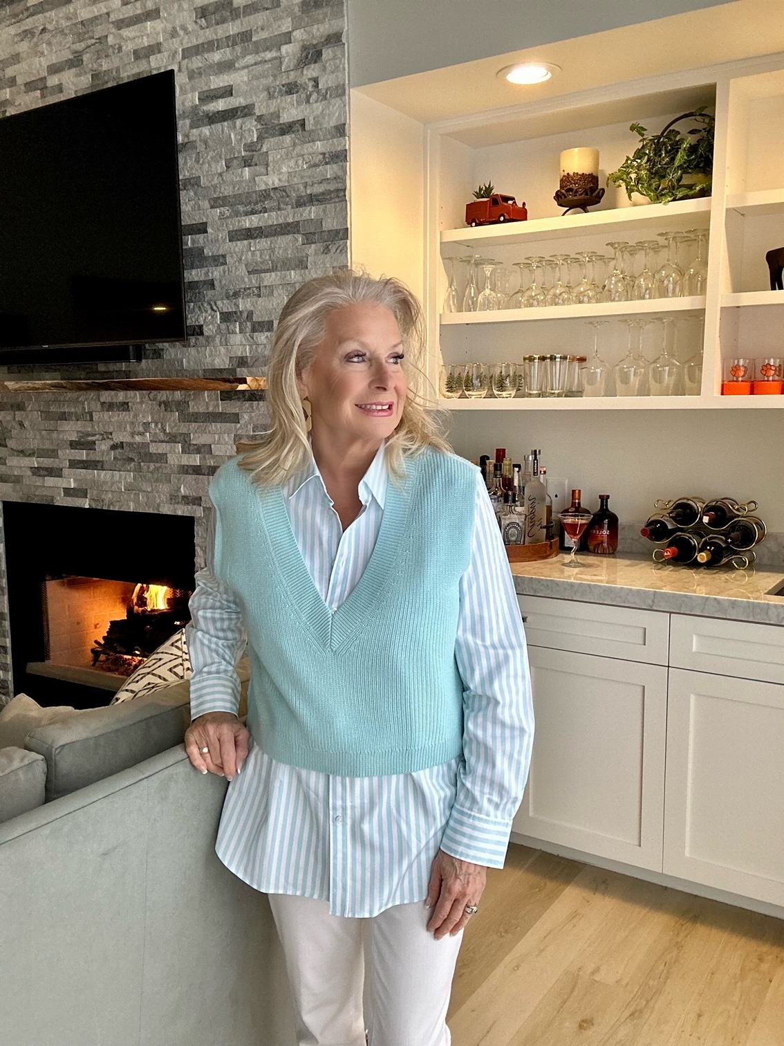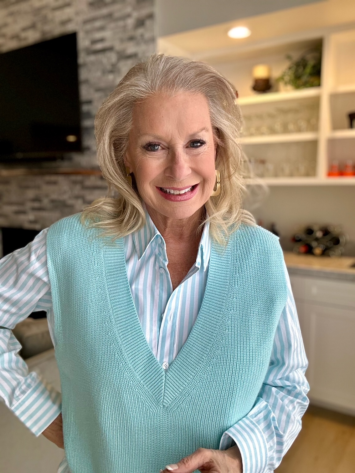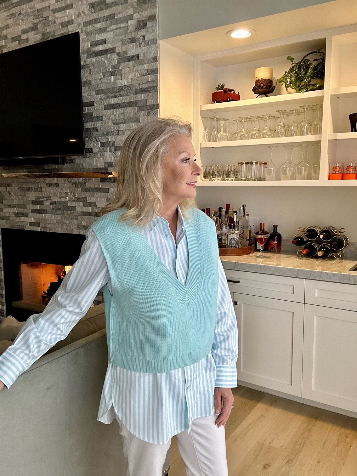 I am wearing the Cropped Shaker Stitch Sweater Vest in Aqua Blue, but it also comes in Capri Blue. The sweater vest looks wonderful with the Aqua Blue Side Button Boyfriend Shirt – Sailboat Stripe.