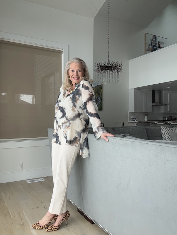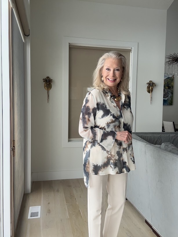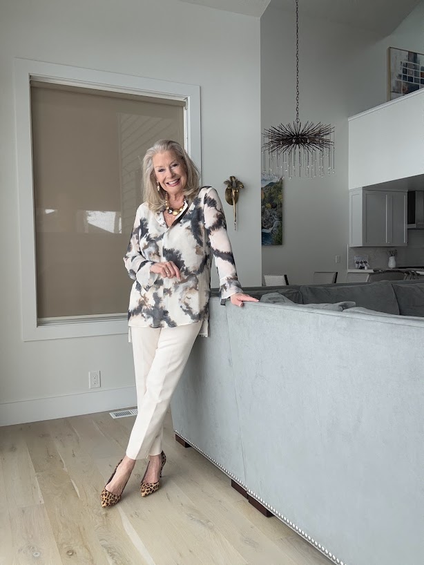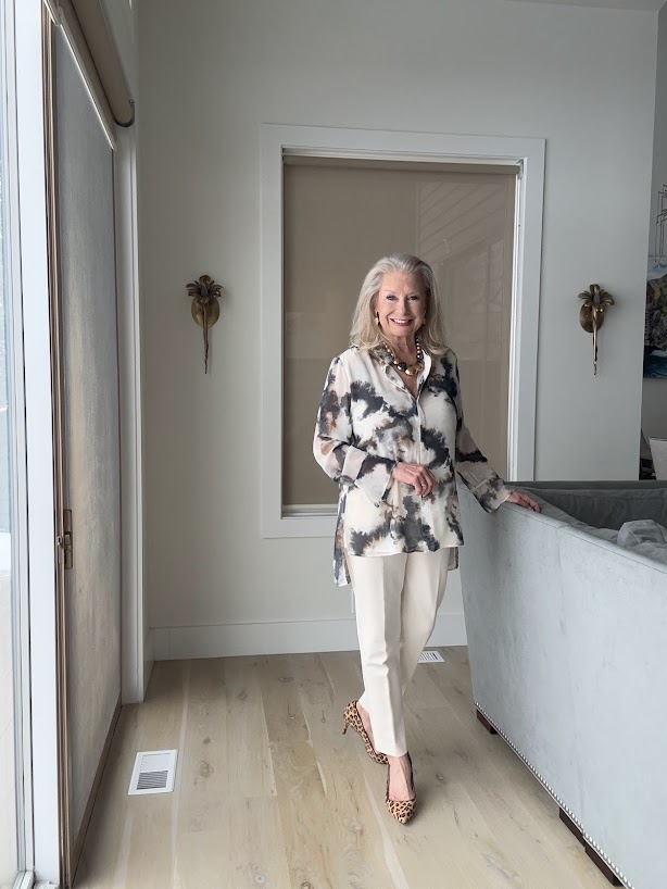 I am wearing Chico’s Tie-dye High-low Tunic with the No Droop™ Embellished Tulip Drop Earrings, the Mixed Metal Sphere Bib Necklace, and the Juliet Ponte Trim Detail Ankle Pants.