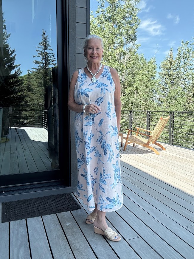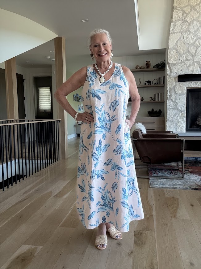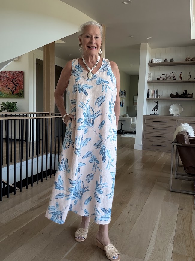 I selected this Sleeveless V-neck maxi Dress because of its colors and linen construction. This A-line dress in aqua and sorbet has pockets and an airy feel. It would look wonderful with a denim jacket or a wrap.