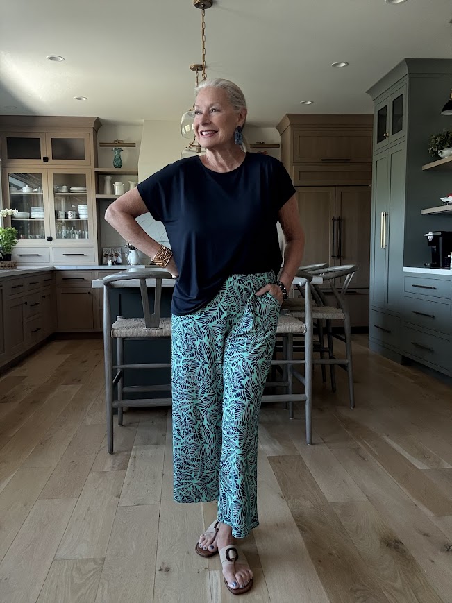 For a casual summer fashion, I am wearing the Wearever Wide-Leg Knit Crops with the Wearever Easy Cap-Sleeve Tee in navy. The top is intended to drape loosely on the body. I recommend purchasing your typical size or sizing down for a slimmer fit. For sizing purposes, I am wearing a medium in both the pants and the top.