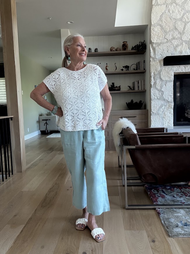 I absolutely love these Pure Jill Linen Cropped Pants. This lucite color is mint green, and the cropped pants come in three other colors. They are a summer wardrobe must-have: breezy, lightweight linen pants that move with you. I selected to wear the Pure Jill Textured Cotton Sweater over the Perfect Reversible Tank. I love the details of the sweater!