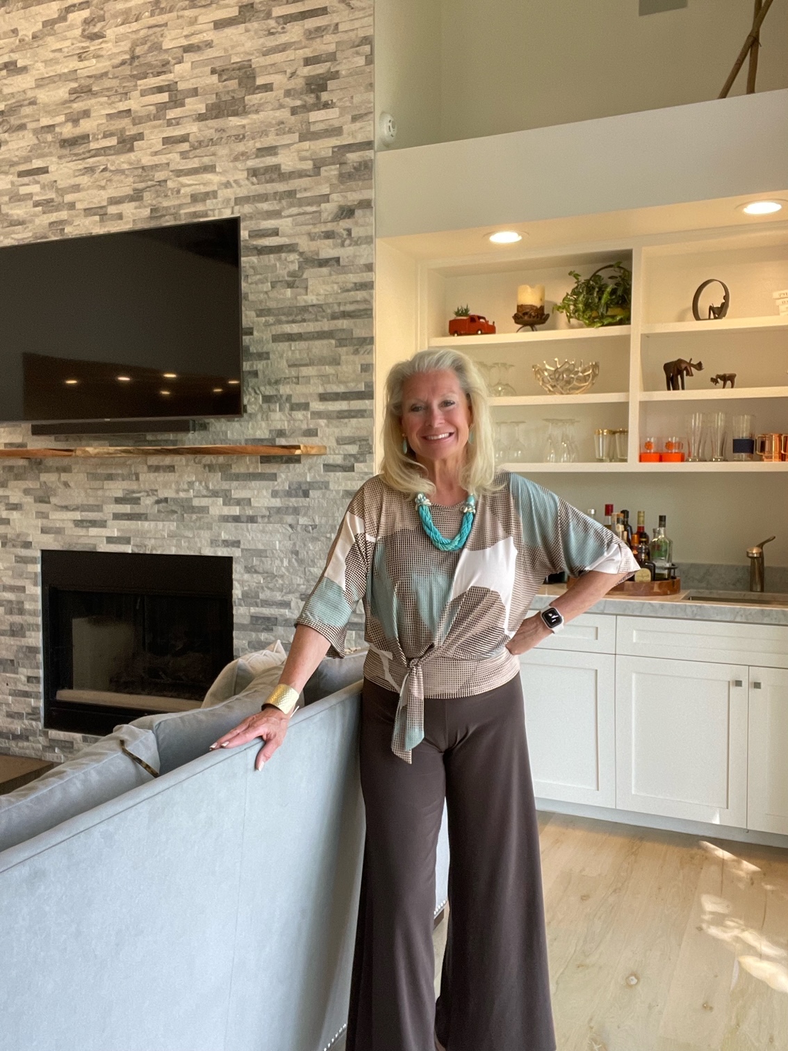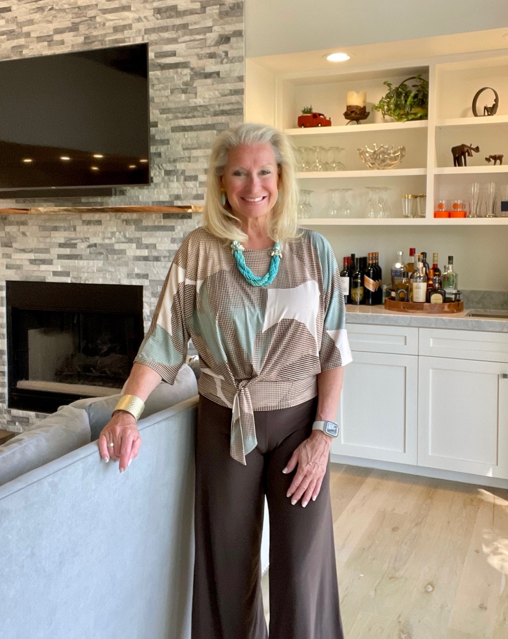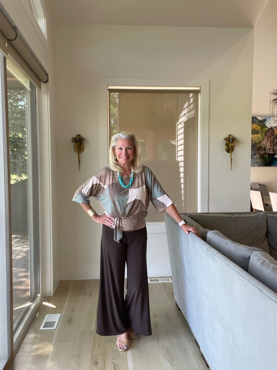 I am wearing the Signature Palazzo Pants in brown with the top. The pull-on pants also come in four other colors too. You could also wear the palazzo pants in black or ivory with this top.