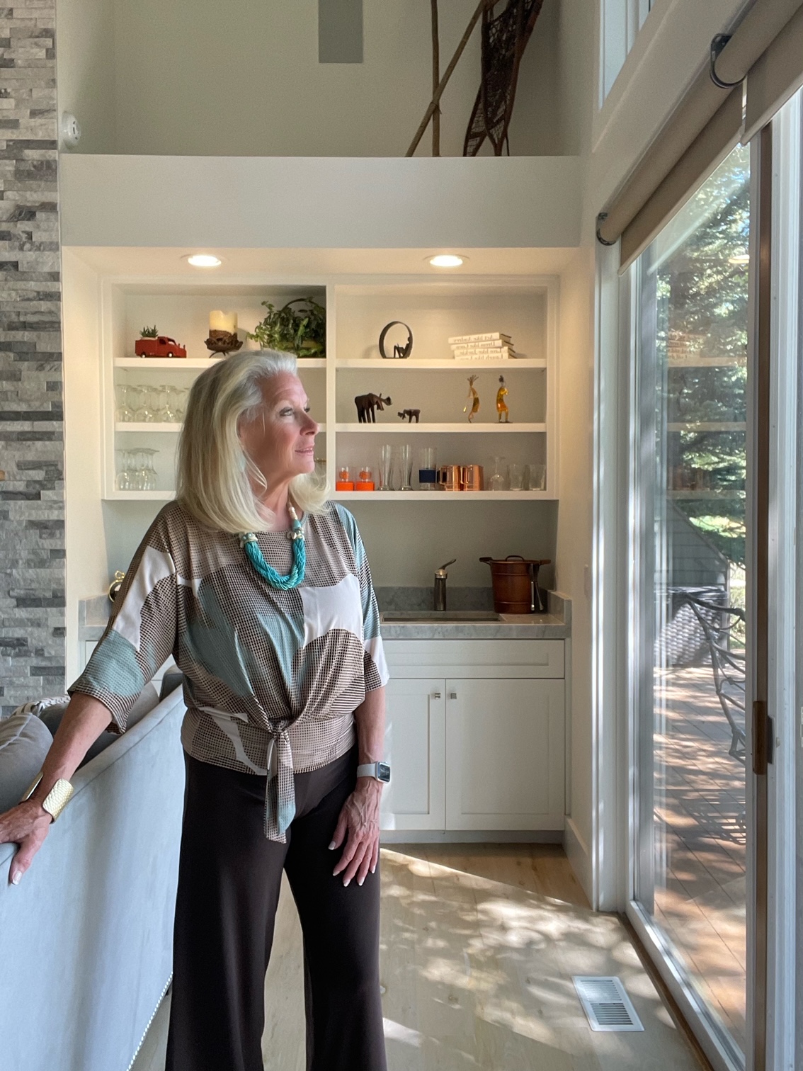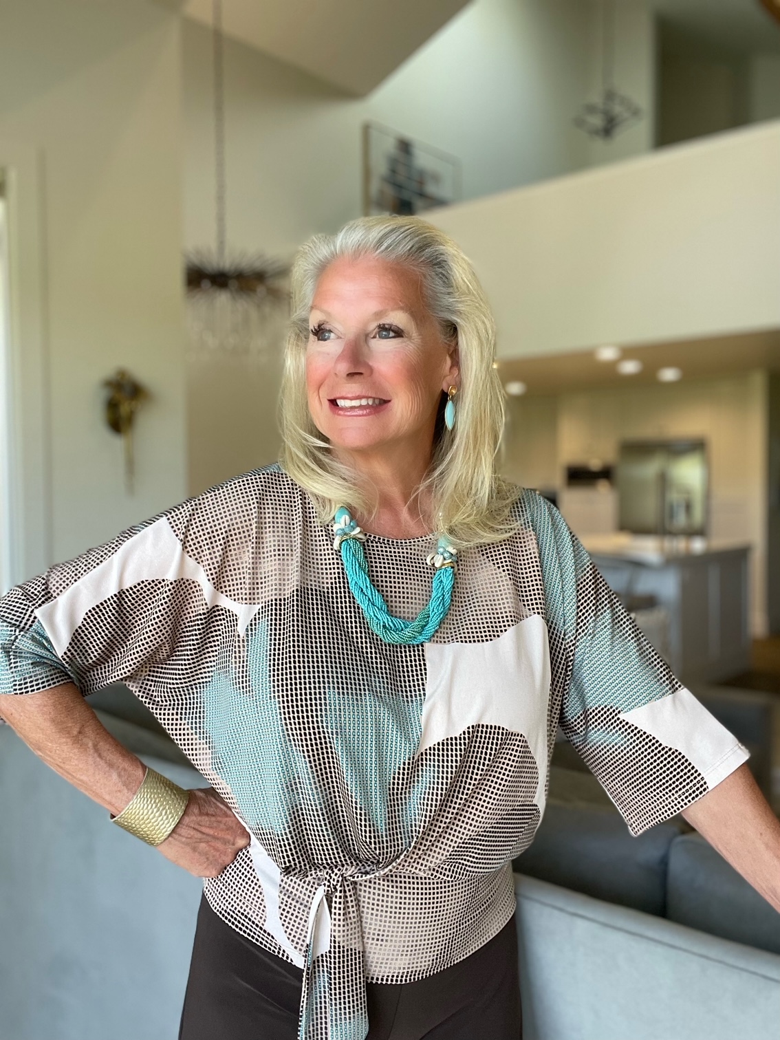 If you follow fashion color trends for 2022, two of the colors that will be popular are shades of brown and green. You will see a lot of caramel brown and jade green in the stores for fall.. This color combination is found in this Abstract Grid Side Tie Top from Clara Sunwoo. A grid-like placement forms to create a series of beige and black squares, hints of jade green, over subtle abstract floral shapes. The jade green looks bluish, almost like aquamarine. So you can wear turquoise jewelry with the top as I did. I bet if you have jade-colored jewelry, this would also look lovely with the top. However, it’s a more blue-green color than a jade green color.