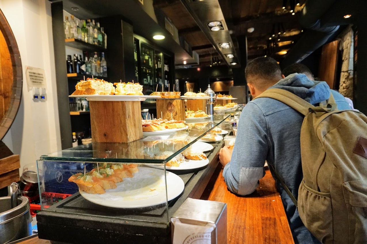 The pintxos bar is one of the most symbolic elements of Basque culture. They are small pieces of bread, topped with various ingredients and are speared through the middle with a stick. You’ll find them lined up along the bar, and the idea is to help yourself and count up the sticks and the end to find out how much you owe.