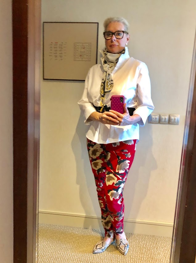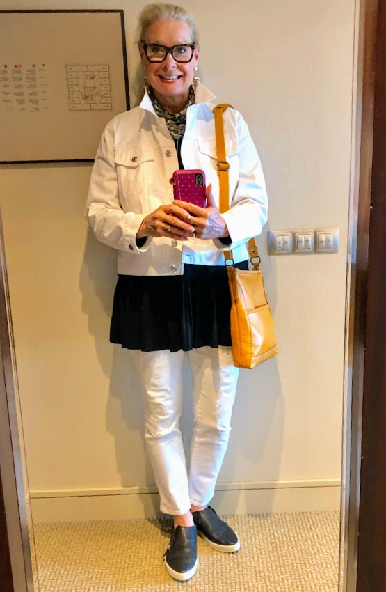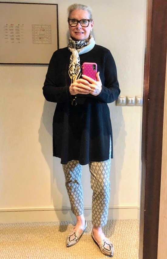 This daytime outfit was my favorite. White skinny jeans, black pleated top, camo scarf, and my denim jacket completed this look. My black leather pull ons are extremely comfortable and I walked 6- 8 hours every day with my husband and felt just fine. I highly recommend you purchase good walking shoes when you are sightseeing.