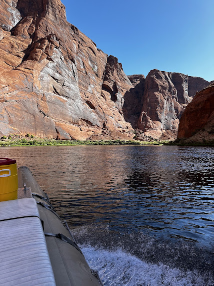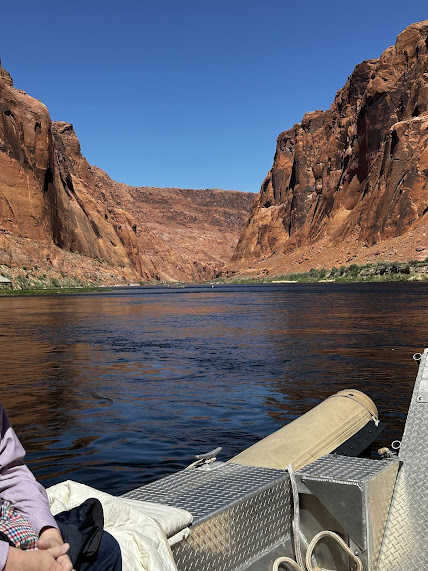 The 2 1/2 hour float trip on the Colorado River takes you through Glen Canyon; your experienced river adventure guide imparts a wealth of knowledge about the canyon as you glide past colorful walls of Navajo sandstone. We dressed in layers because it was chilly on the river until we were in the sunshine.