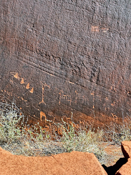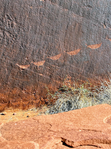 The Descending Sheep Petroglyph Panel along the Colorado River is estimated to be 3,000 to 6,000 years old and is interpreted as a hunting scene. The rock art panel is almost exactly halfway between Glen Canyon Dam and Lees Ferry.