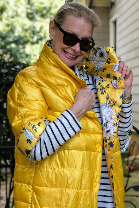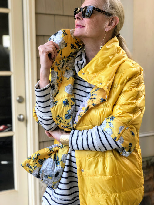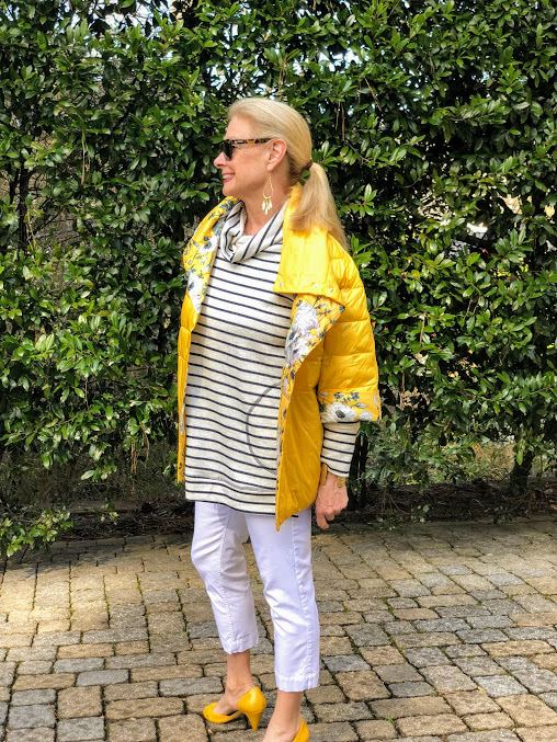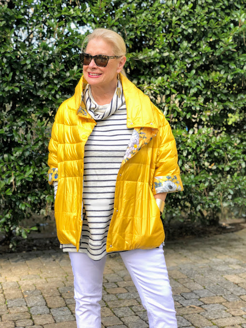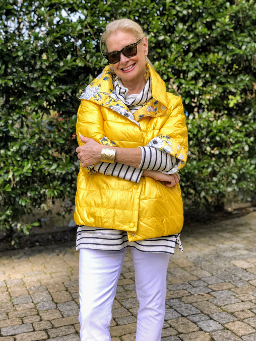 I love bright colors and fell in the with this yellow reversible puffer jacket. Perfect for winter while looking ahead to spring. The stripes in the tunic work very well with the floral print. I am wearing white pants but this would also look good with jeans for a super casual style.