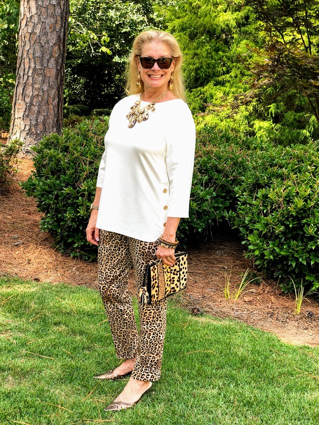 I am wearing the Juliet leopard print ankle pants that now have the So Slimming® technology you love—and it’s better than ever, with a new and improved front panel that has even more comfort and stretch, and better tummy control. I have on the Ponte Button detail top that is so laidback and chic and is a perfect work-to-weekend top. The relaxed fit with a high-low hemline keeps you comfy, while the side button details add a touch of polish. I’ve even added Leopard print bangle set to finish off my outfit. The watch and the clutch were from last fall. The bronze mules are over 5 years old and I’m so glad mules are making a comeback! Best shoe style ever created! Pay attention to the animal print this yera ladies, it’s still a hot fashion trend!