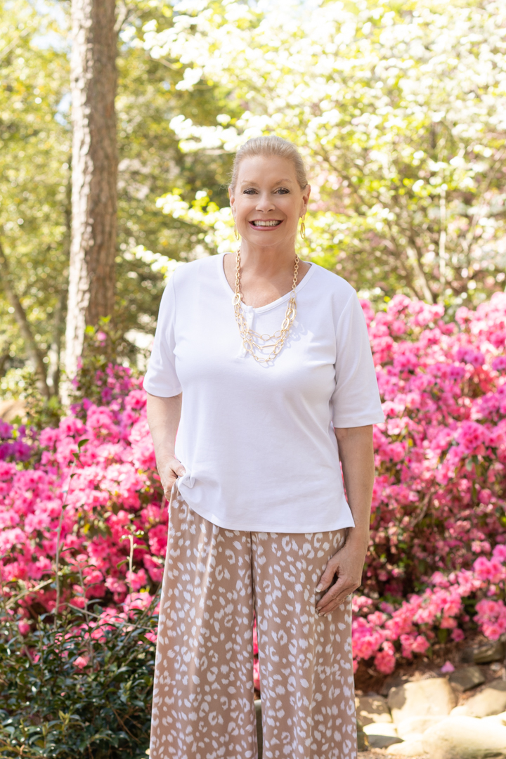 In a fabulous stretch knit with a leopard print, these wide-leg pants will make you the queen of the catwalk. They also come in a mocha leopard print. I am wearing the Essential V-Neck Henley also from Draper’s and Damon’s. A classic v-neck henley is a style staple every closet needs. For cute and casual outfits and as a must-have layering piece, a henley gives your look a fun boost of classic style. The Henley comes in eight colors.