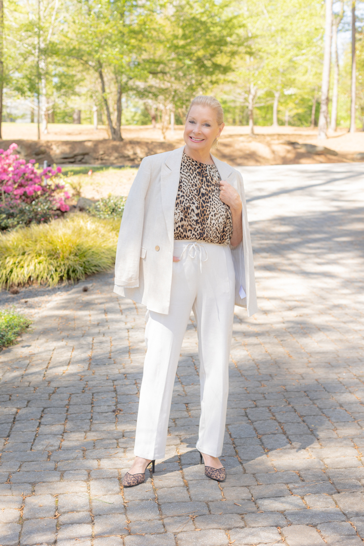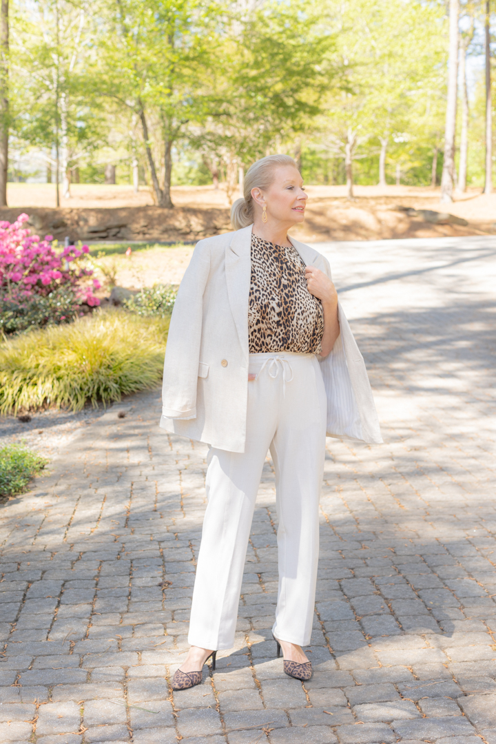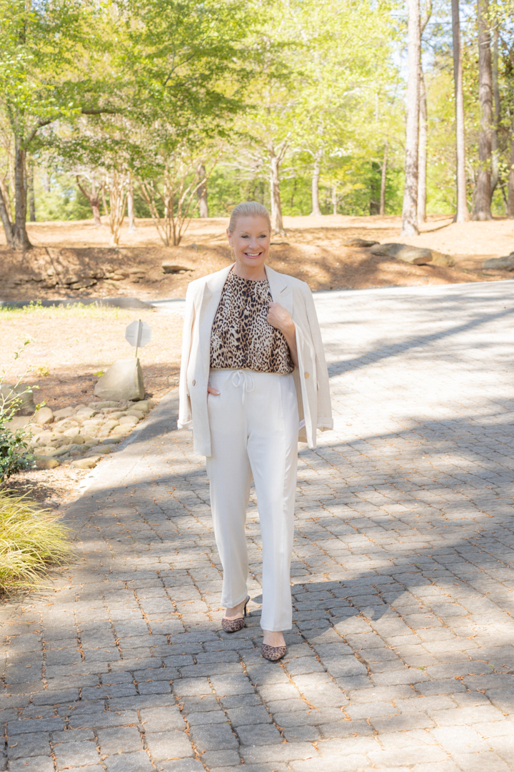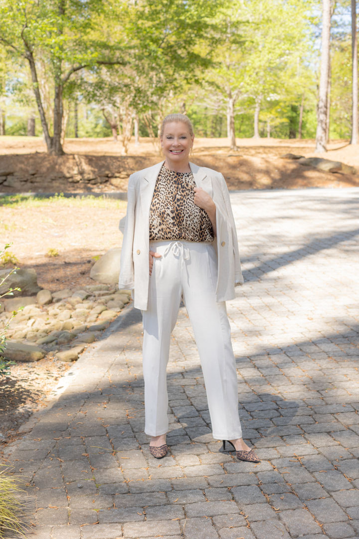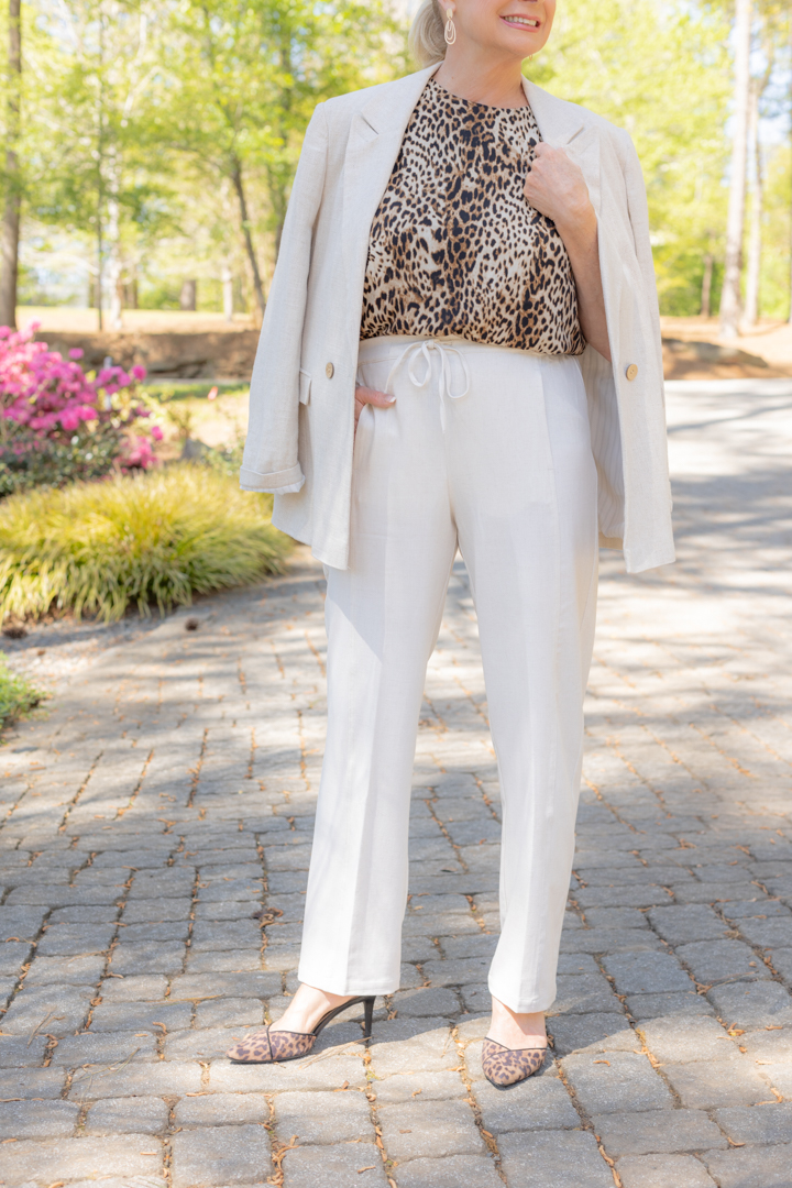 I decided to dress up the pants with a linen blazer and leopard print shirt that I already had in my closet. These pants will go with so many tops I already have in my closet.