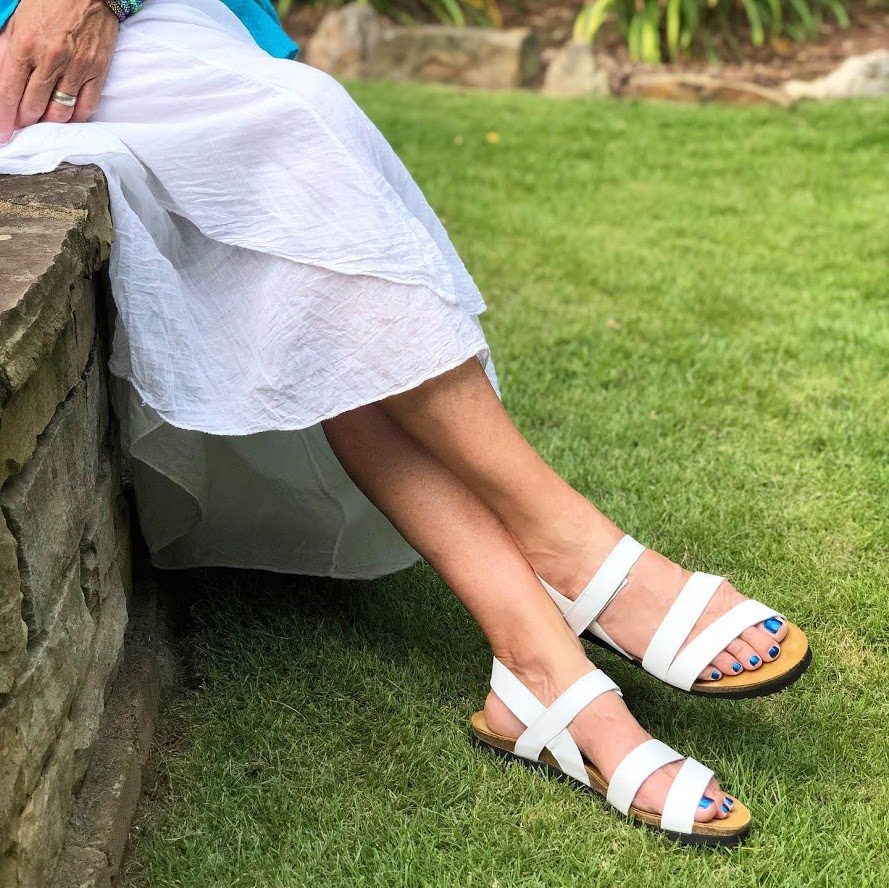 The Kayla is a three-strap sandal with a hook & loop strap at the instep and a backstrap for added stability and support. Naot’s anatomic cork & latex footbed is wrapped in suede and molds to the shape of the foot with wear. So unbelievably comfortable walking 6 hours a day in them.