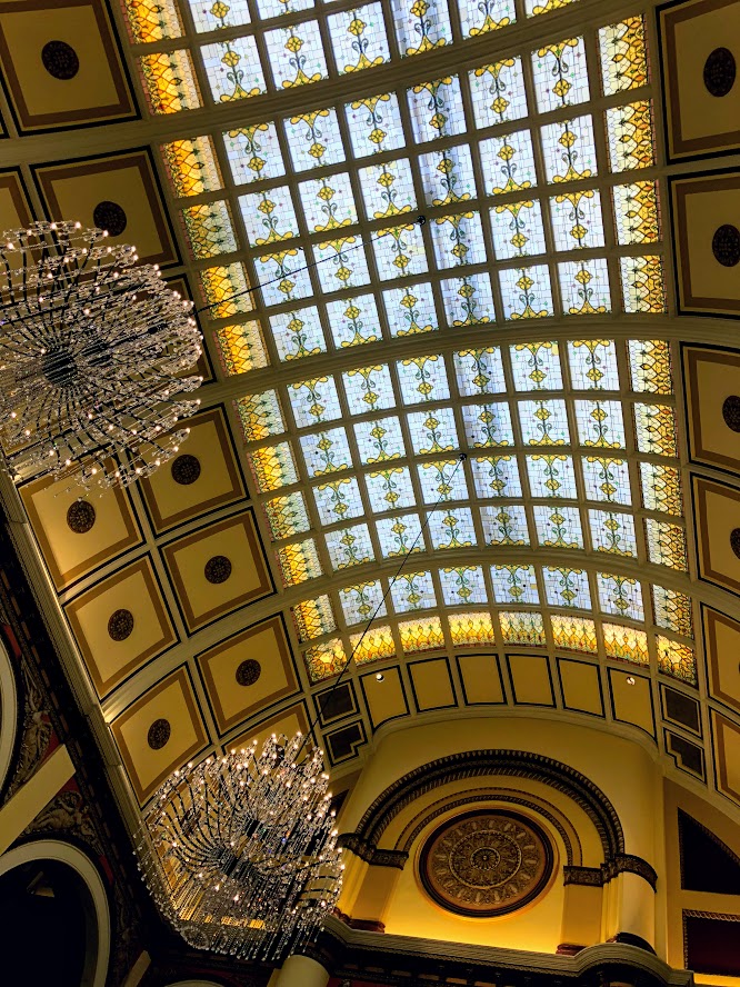 I love the stained glass barreled ceiling which is the original stained glass and the gold leaf medallions.