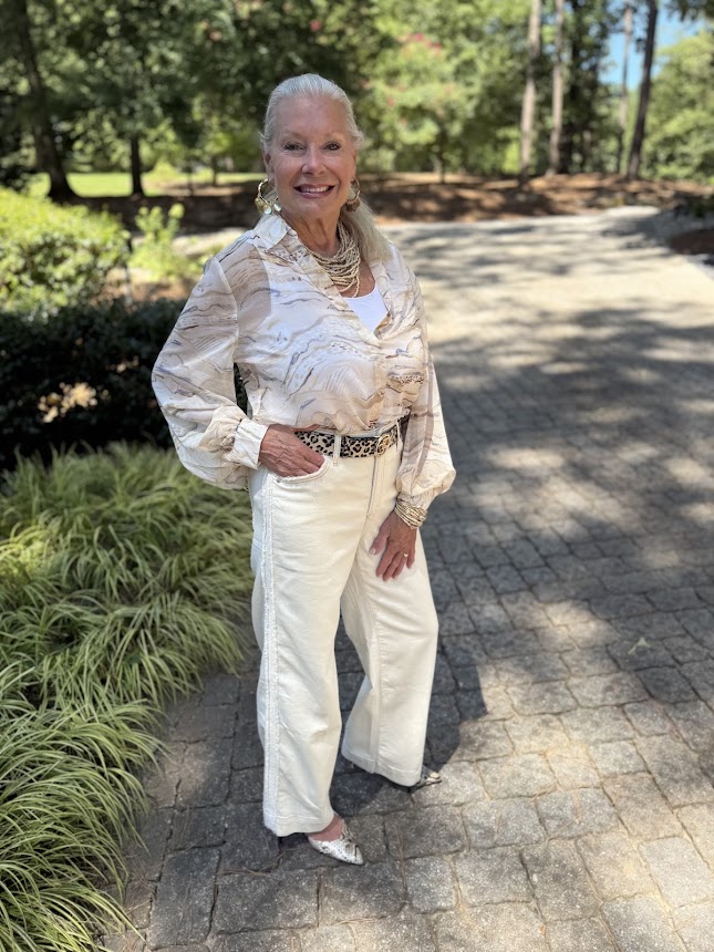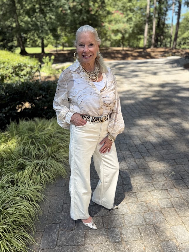Think plaid button-down shirts, chambray blouses, or flowy peasant tops. These pair effortlessly with jeans or skirts, offering both structure and femininity. I am wearing the Georgette Blouson Sleeve Blouse with a Microfiber Tank underneath. My Sea Salt High-Rise Frayed Jeans look great paired with the leopard print belt from Chico’s, which I received last year. Leopard print is back for the fall! My jewelry is the Multi-Layered Bead & Collar Necklace, the Layered Bead & Abalone Bracelet, and the No Droop® Shell-Disc Hoop Earrings.